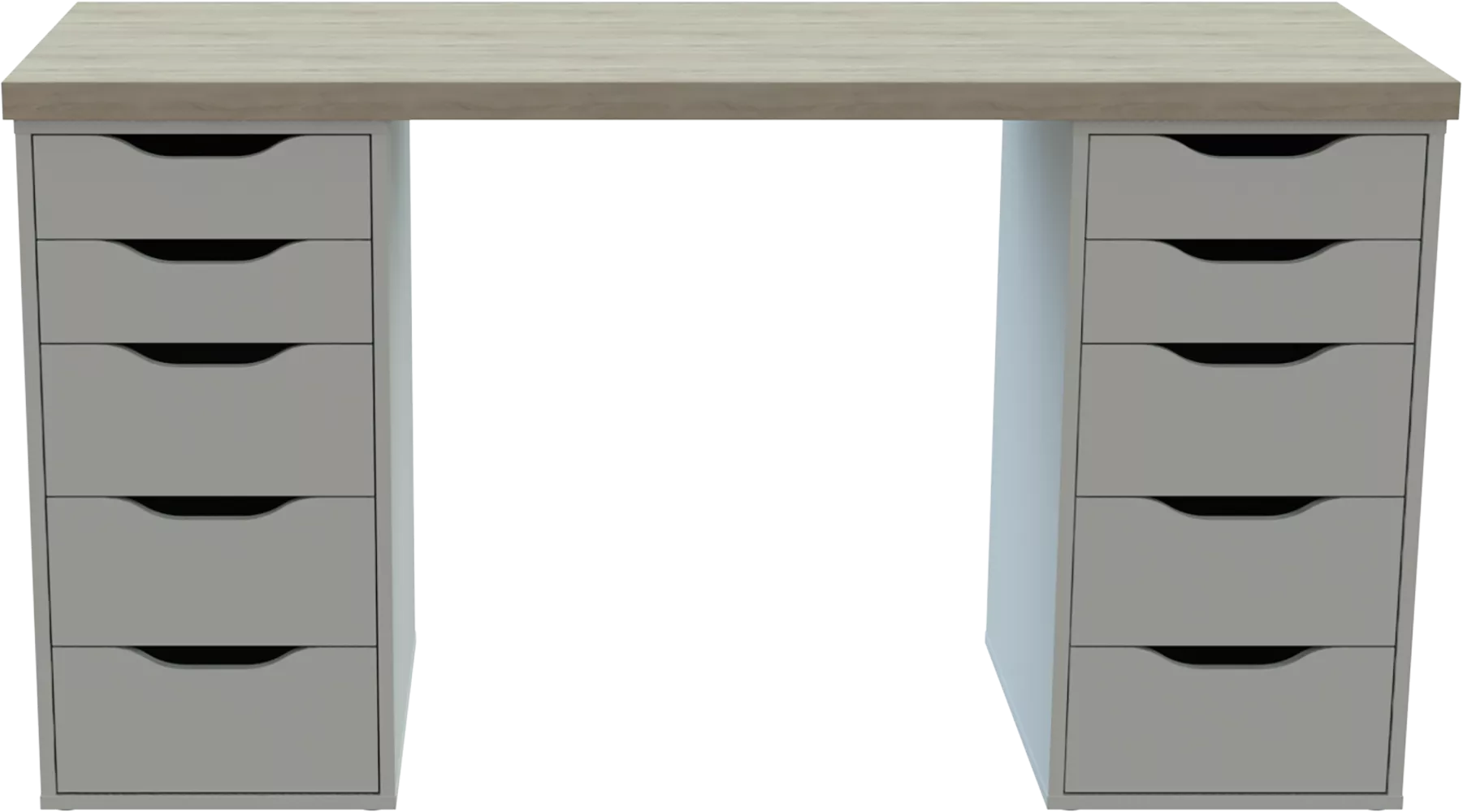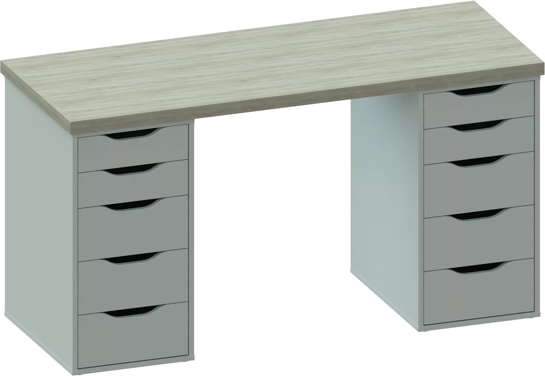 Стол письменный Ингар 2/55, 140x75x55, цвет Дуб беленый/Белый. Стол комплектуется столешницей и двумя тумбами под столешницу с пятью выдвижными ящиками в каждой тумбе. Конструкция столешницы - тамбурат (рамка из ДСП и HDF с сотовым заполнением) - популярная современная технология, активно внедряемая крупнейшими производителями для изготовления мебели по скандинавским стандартам. Конструкция тумб стола: ДСП, поверхность, декорированная бумага, окраска УФ материалами. Фасады ящиков без ручек, с вырезами для удобного выдвижения. Ящики переменной высоты позволяют использовать их для хранения разнообразных предметов. Преимущества: облегченная конструкция (тамбурат); высокая прочность, устойчивость; простая, быстрая сборка; эстетичный внешний вид. Гарантийный срок для жилых и общественных помещений 24 месяца.