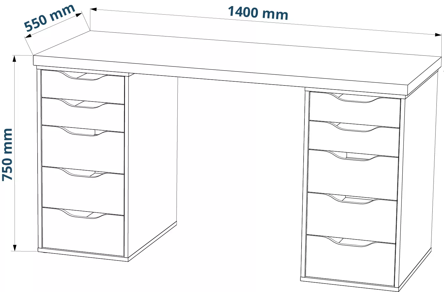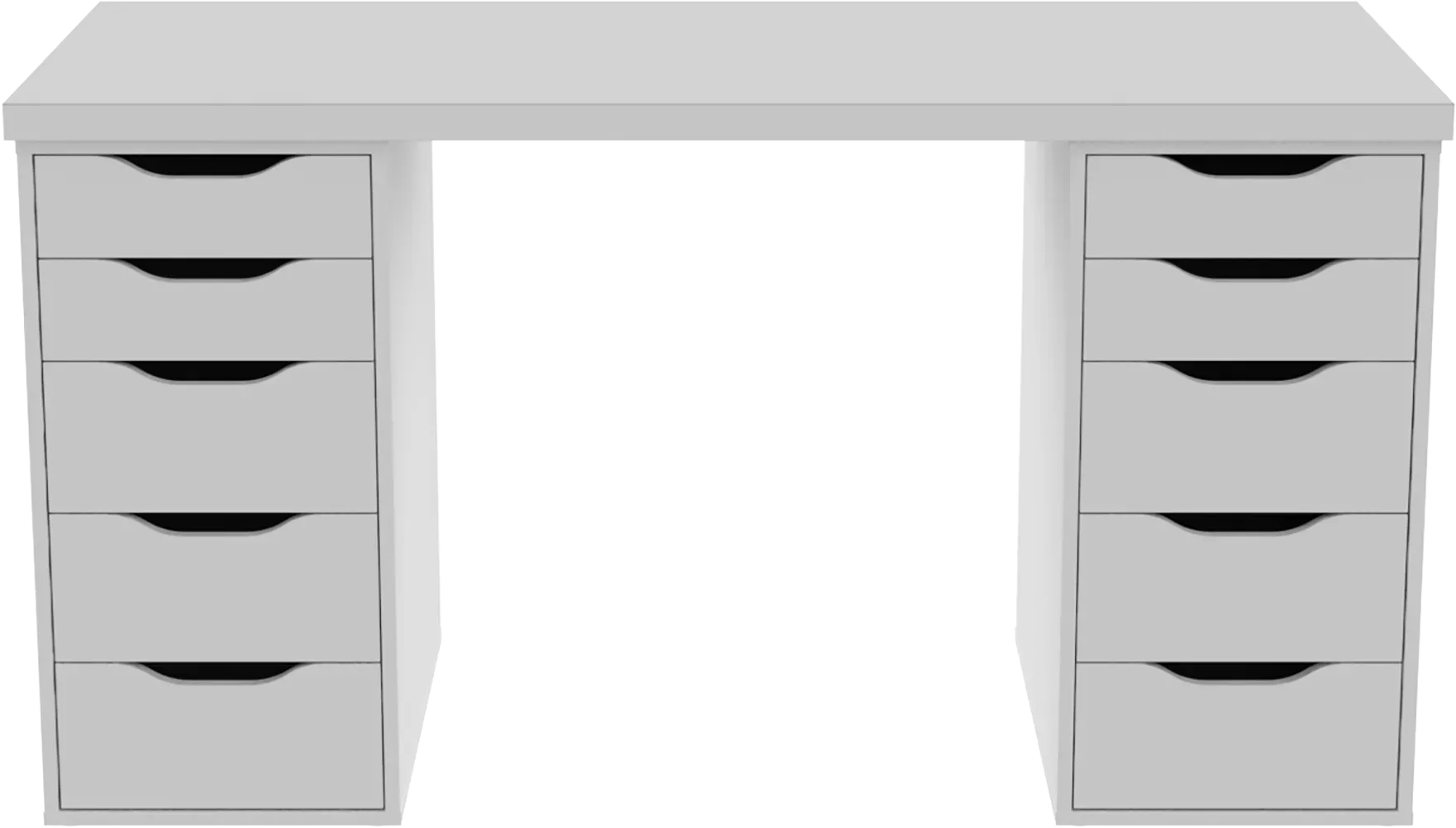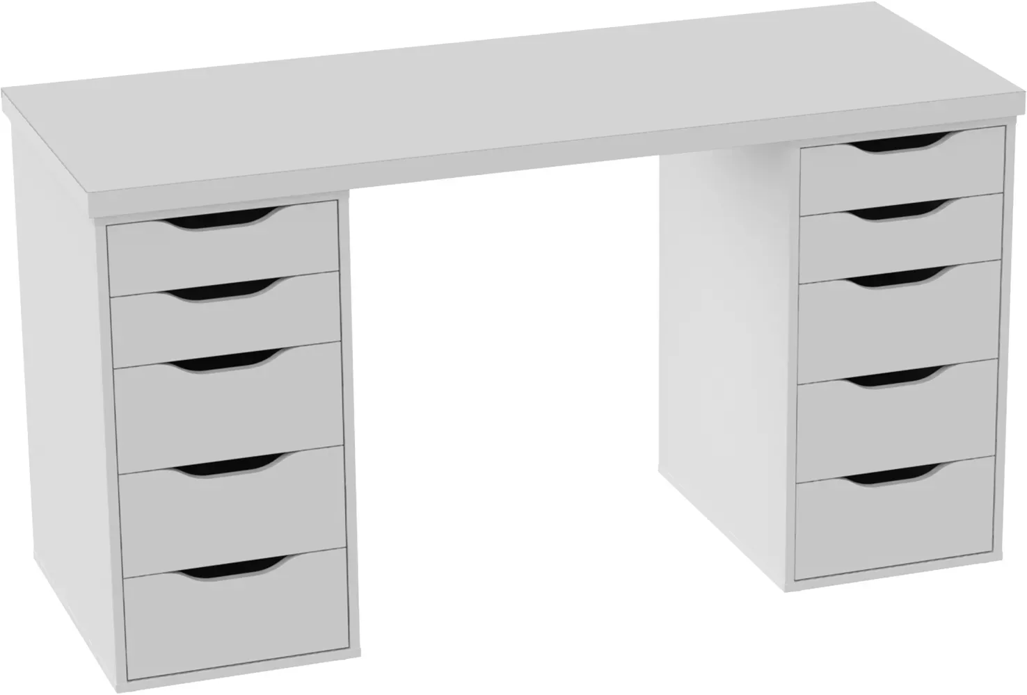 Стол комплектуется столешницей и двумя тумбами под столешницу с пятью выдвижными ящиками в каждой тумбе. Конструкция столешницы - тамбурат (рамка из ДСП и HDF с сотовым заполнением) - популярная современная технология, активно внедряемая крупнейшими производителями для изготовления мебели по скандинавским стандартам. Конструкция тумб стола: ДСП, поверхность, декорированная бумага, окраска УФ материалами. Фасады ящиков без ручек, с вырезами для удобного выдвижения. Ящики переменной высоты позволяют использовать их для хранения разнообразных предметов.