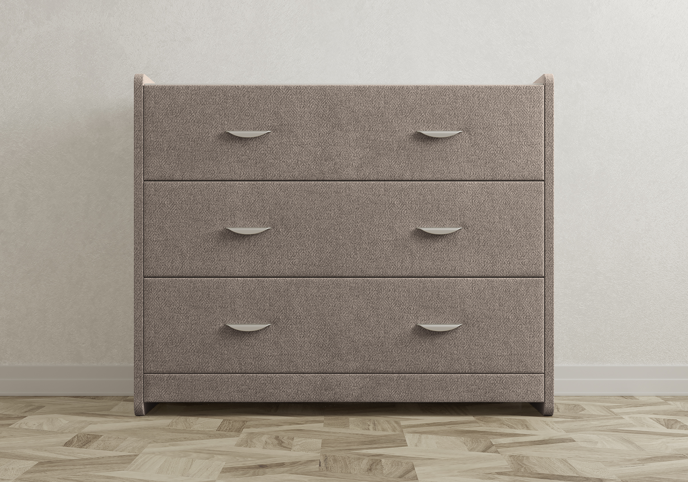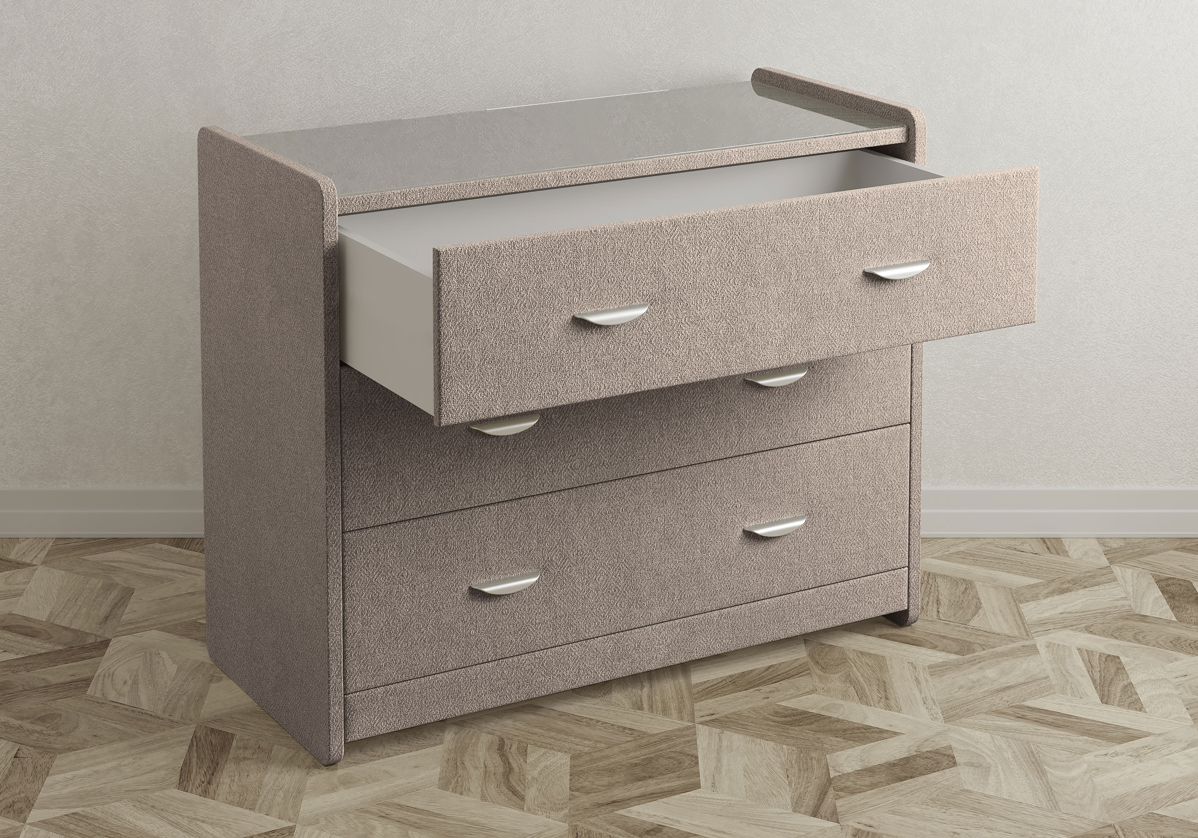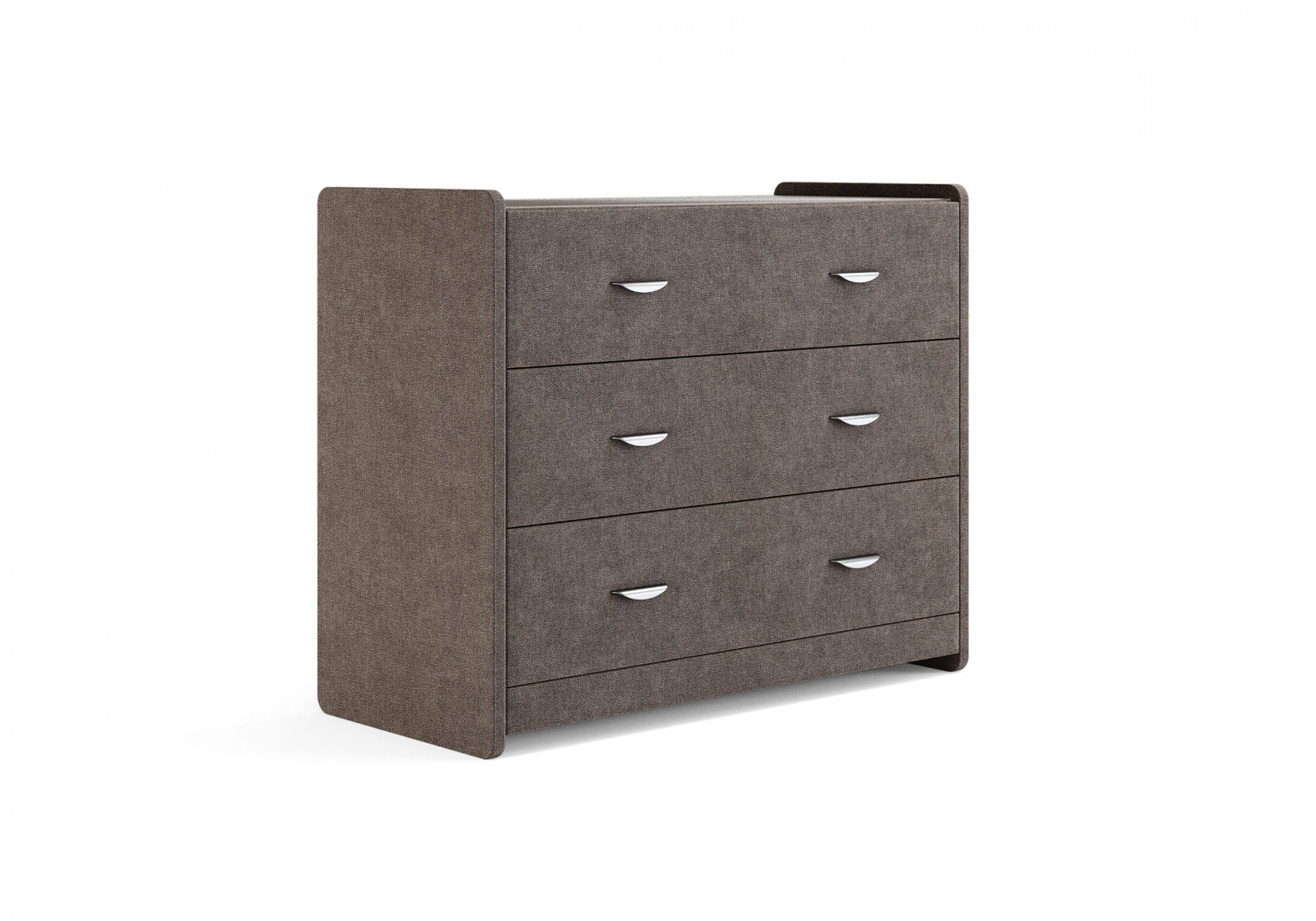 Элегантный комод отличается стильным дизайном и повышенным удобством. Три выдвижных ящика оснащены надёжными направляющими, обеспечивающими лёгкое открытие. Фасад ящиков и стенки комода покрыты обивочным материалом.