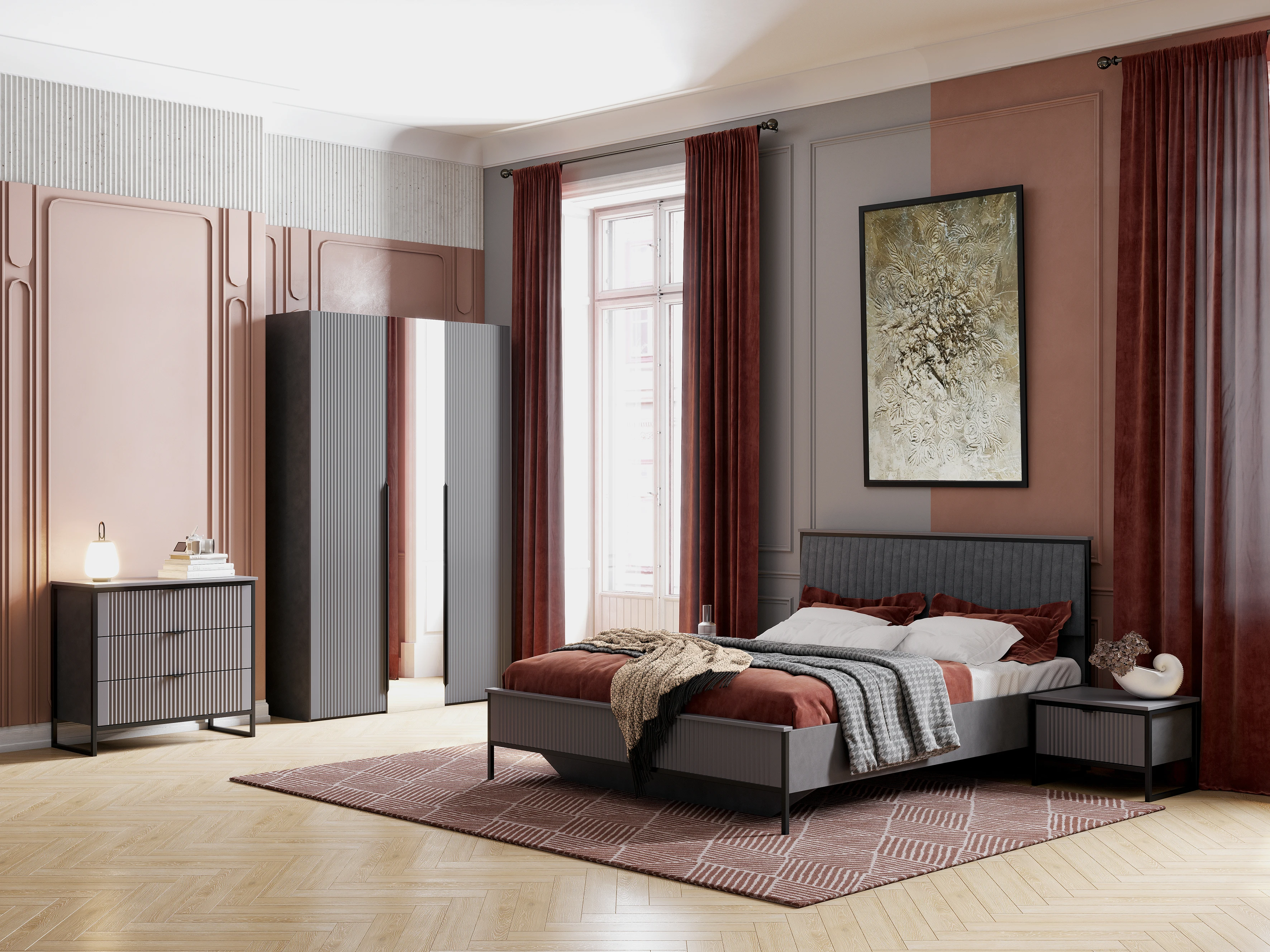 Коллекцию модульной спальни "Нора" отличает современный оригинальный стиль. Декоративная продольная фрезеровка на фасадах из МДФ и опоры на металлокаркасе цвета "Черная эмаль" соответствуют модным тенденциям этого года в ведущих зарубежных коллекциях.