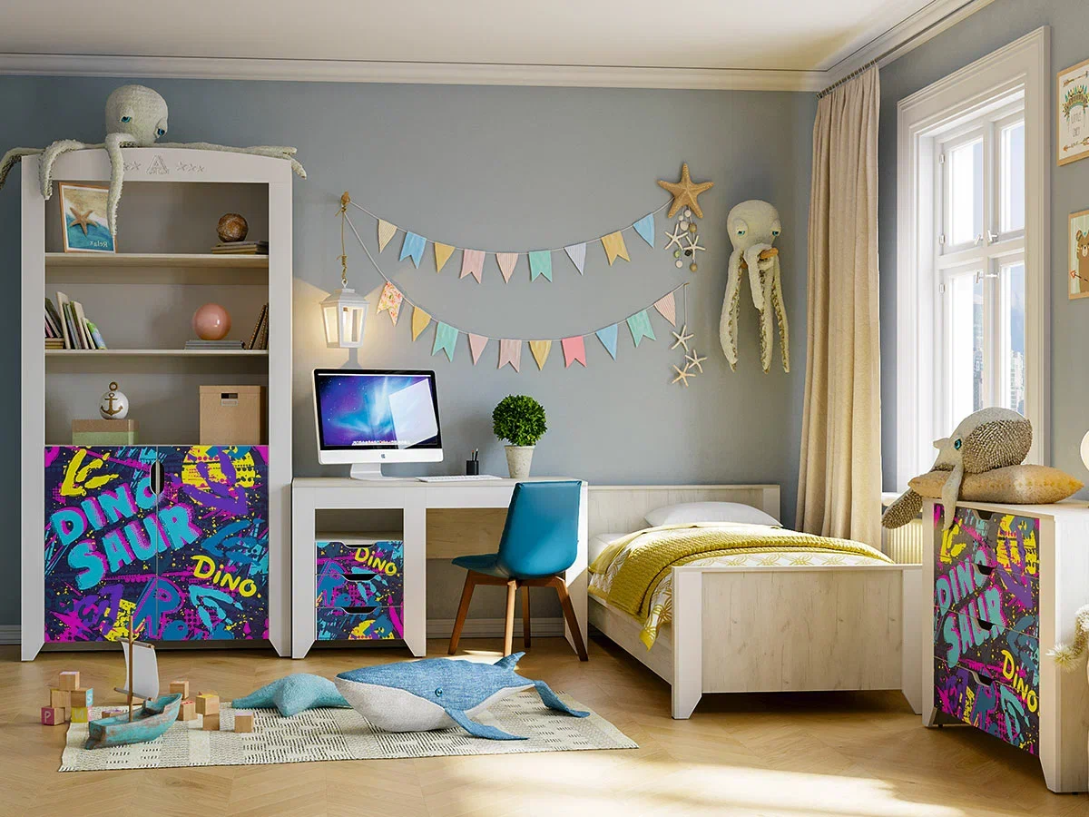 Цветные тематические вставки по фасаду скрадываются на фоне основного белого цвета, за счет чего мебель кажется воздушной и легкой. Невероятные приятные для глаза пастельные оттенки зеленого, голубого и розового способствуют расслаблению, не утомляют нежную психику ребенка.
