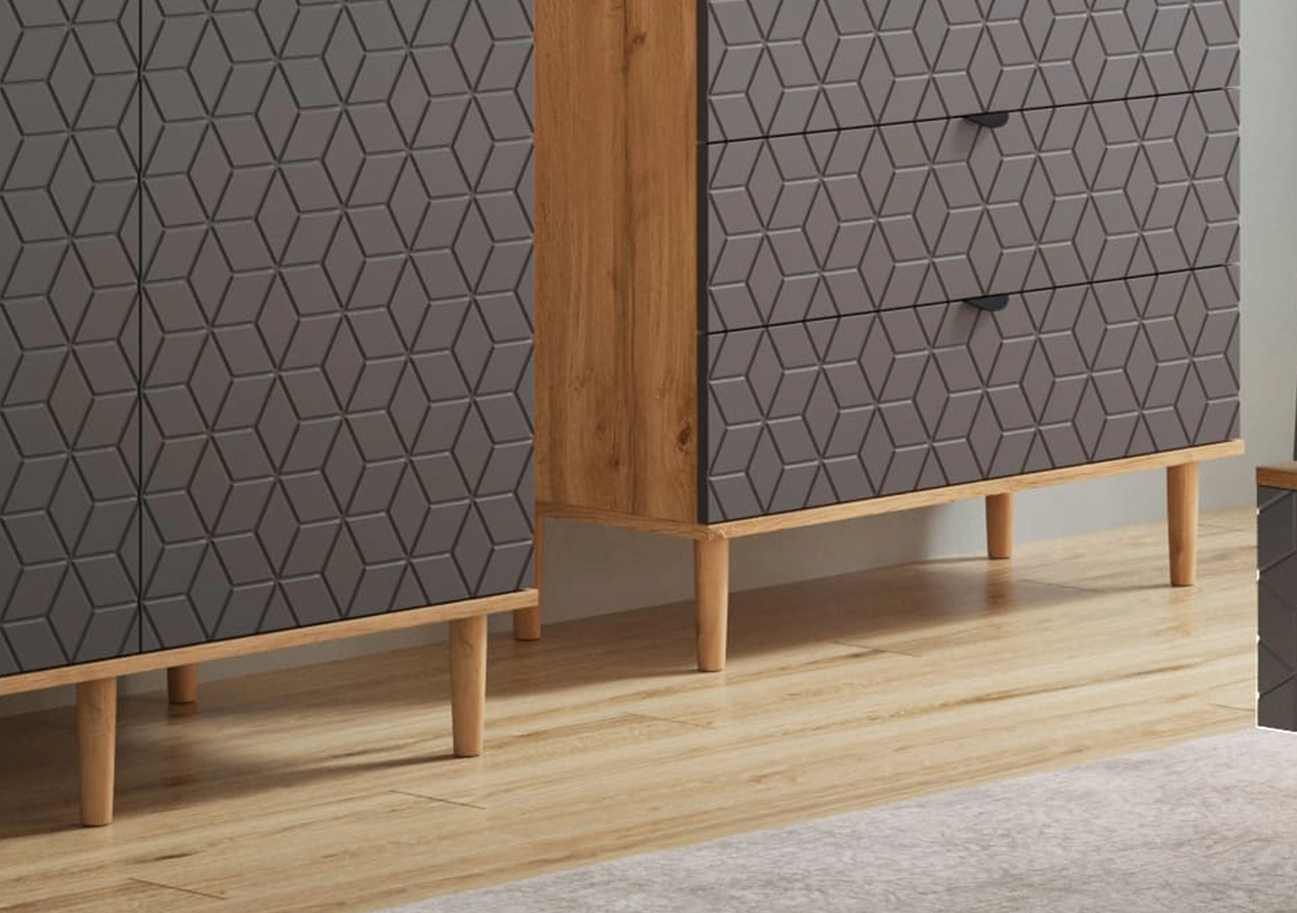 Спальный гарнитур “Денвер” — это изысканное и стильное решение для обустройства вашей спальни. Отличительной особенностью данной коллекции является изящная фрезеровка на фасадах в виде кубов, придающая им неповторимый шарм и элегантность.