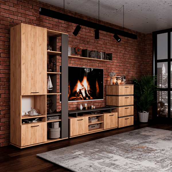 Представляем набор мебели для гостиной Маори в индустриальном стиле, который станет центром притяжения в вашем доме. Этот стильный комплект включает комбинированный стеллаж, тумбу для ТВ, настенную полку и комод с четырьмя ящиками, выполненные в элегантном цвете дуб золотой с серыми графитовыми вставками.
