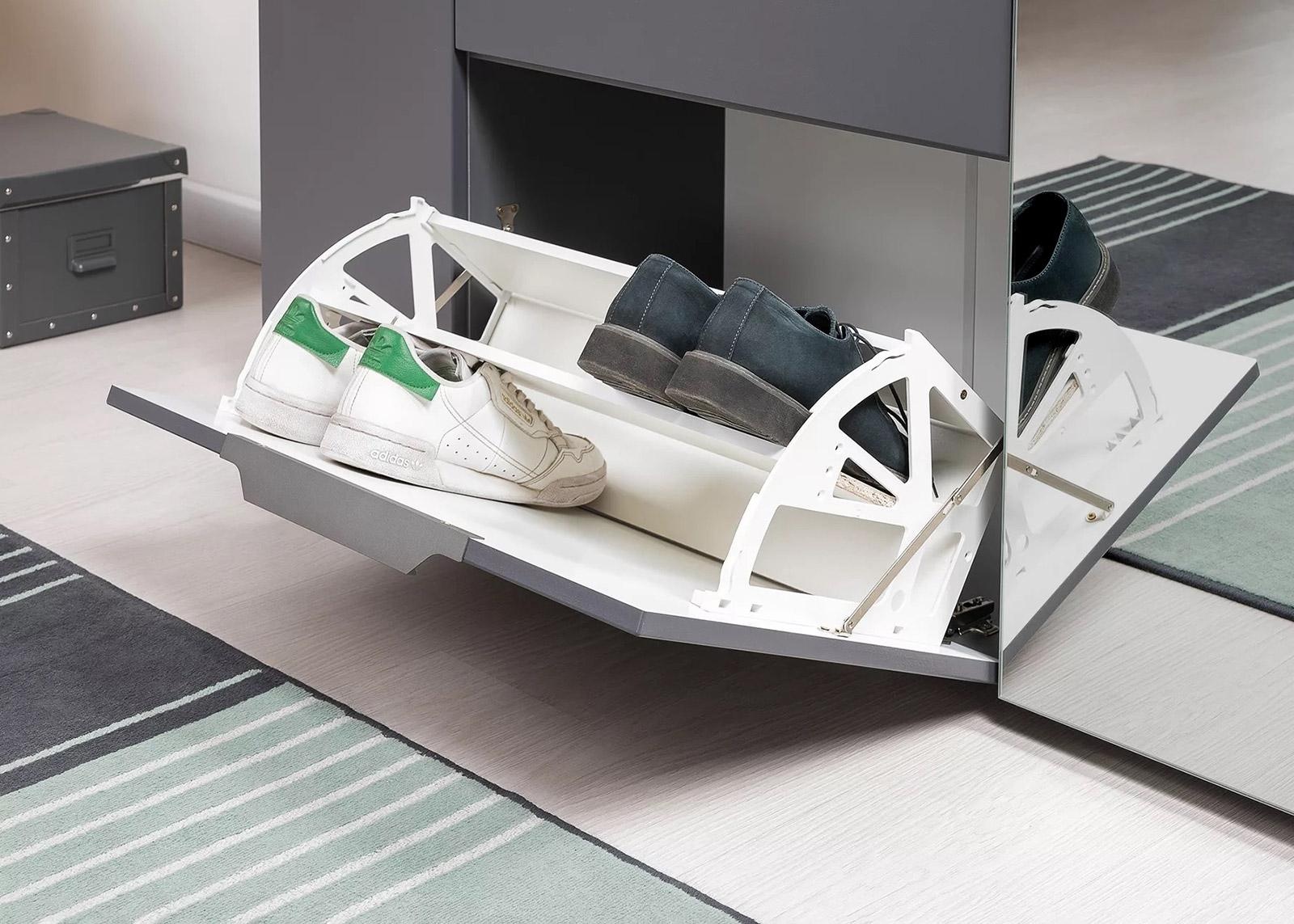 Тумба для обуви Октава МБ-16.127 серого цвета: сверху выдвижной ящик на шариковых направляющих с полным выдвижением, снизу – откидная дверца с пластиковым сектором для обуви.