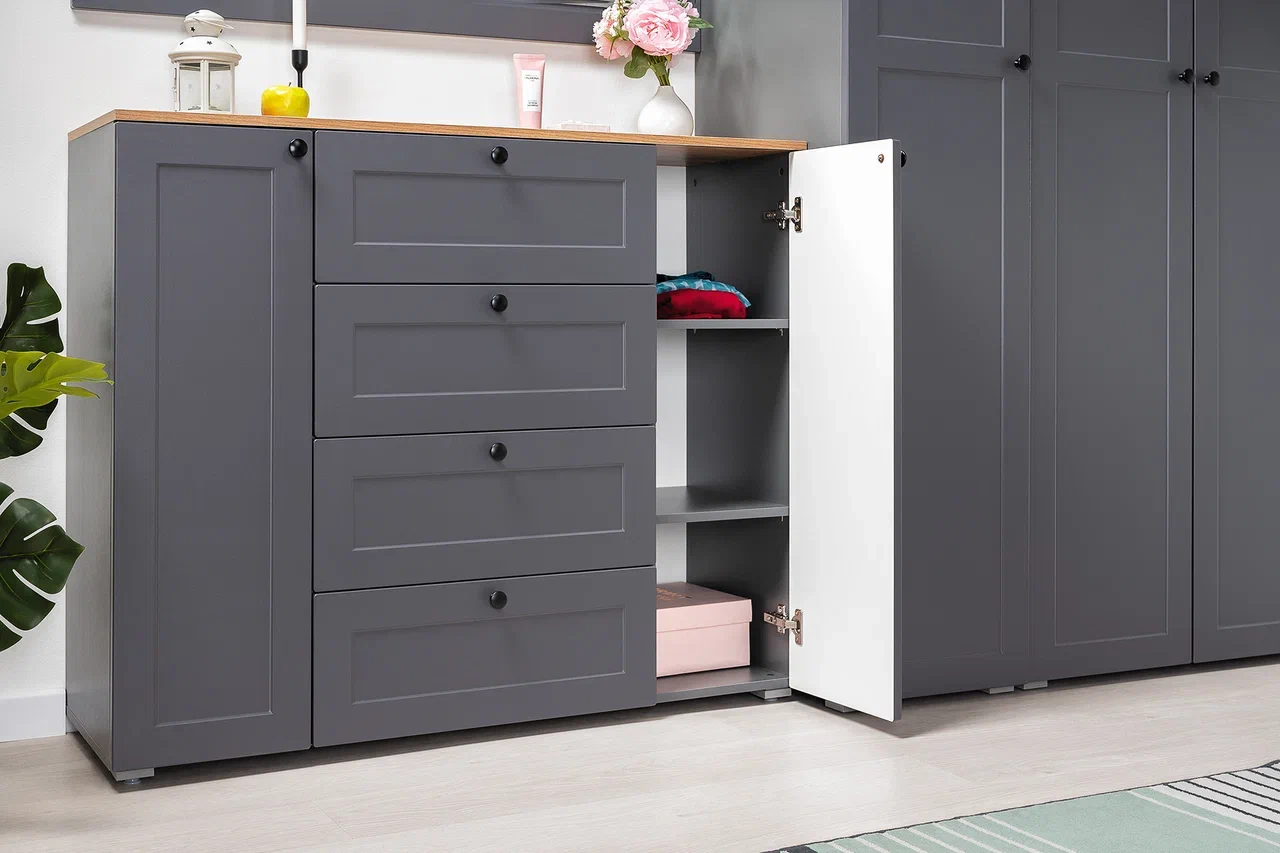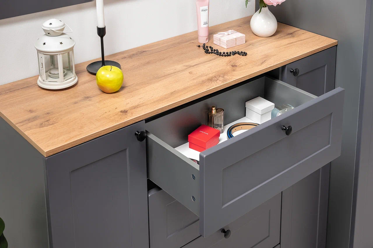 Продуманная система хранения с полками и ящиками обеспечивает практичность и удобство.