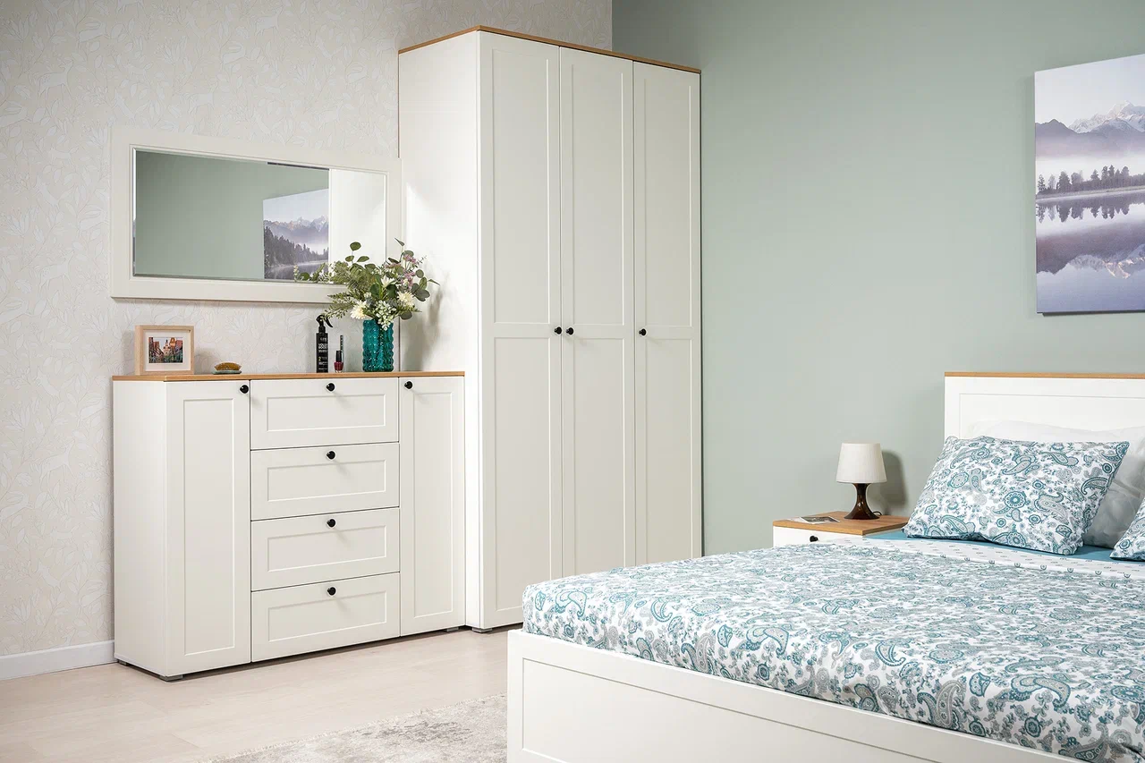 В изголовье кровати предусмотрены вместительные ниши. Шкафная группа полноценной глубины позволяет эффективно организовать систему хранения.