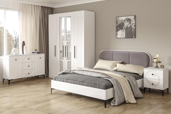 Фасады выполнены из МДФ с матовой ПВХ-плёнкой. Такое решение делает мебель визуально более "мягкой", комфортной и расслабляющей, что особенно актуально для спальни.