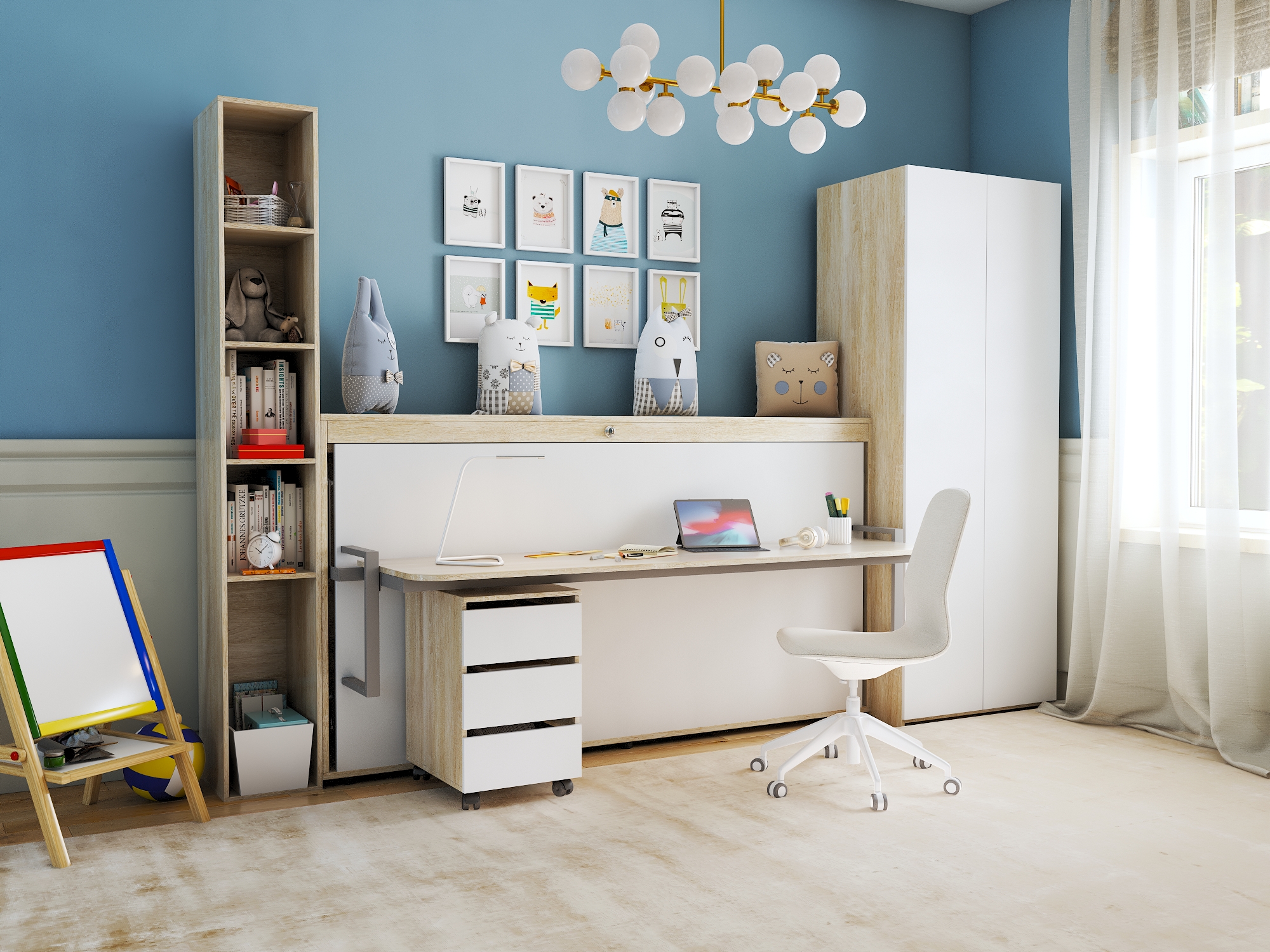 Детская горизонтальная откидная кровать со столом имеет все необходимое в своей конструкции для оптимизации места в детской комнате – кровать-трансформер, рабочий стол и шкаф для «хранения кровати» в дневное время.