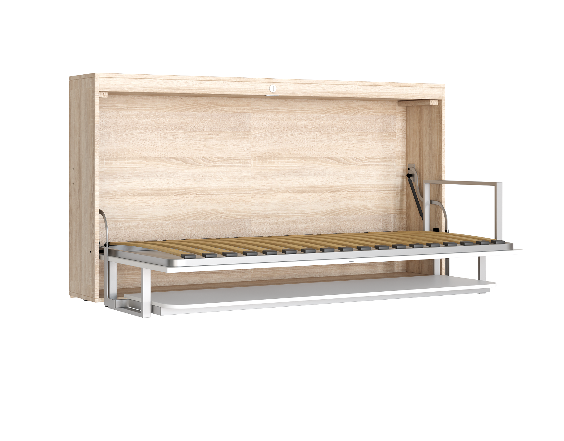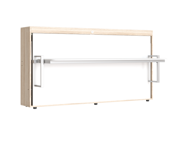 Опорой для кровати служит конструкция трансформируемого стола. Стол сохраняет горизонтальное положение, и все вещи, которые лежат на нем, при открытии и закрытии кровати остаются неподвижны. Когда кровать открыта, стол расположен под ней параллельно кровати и полу.