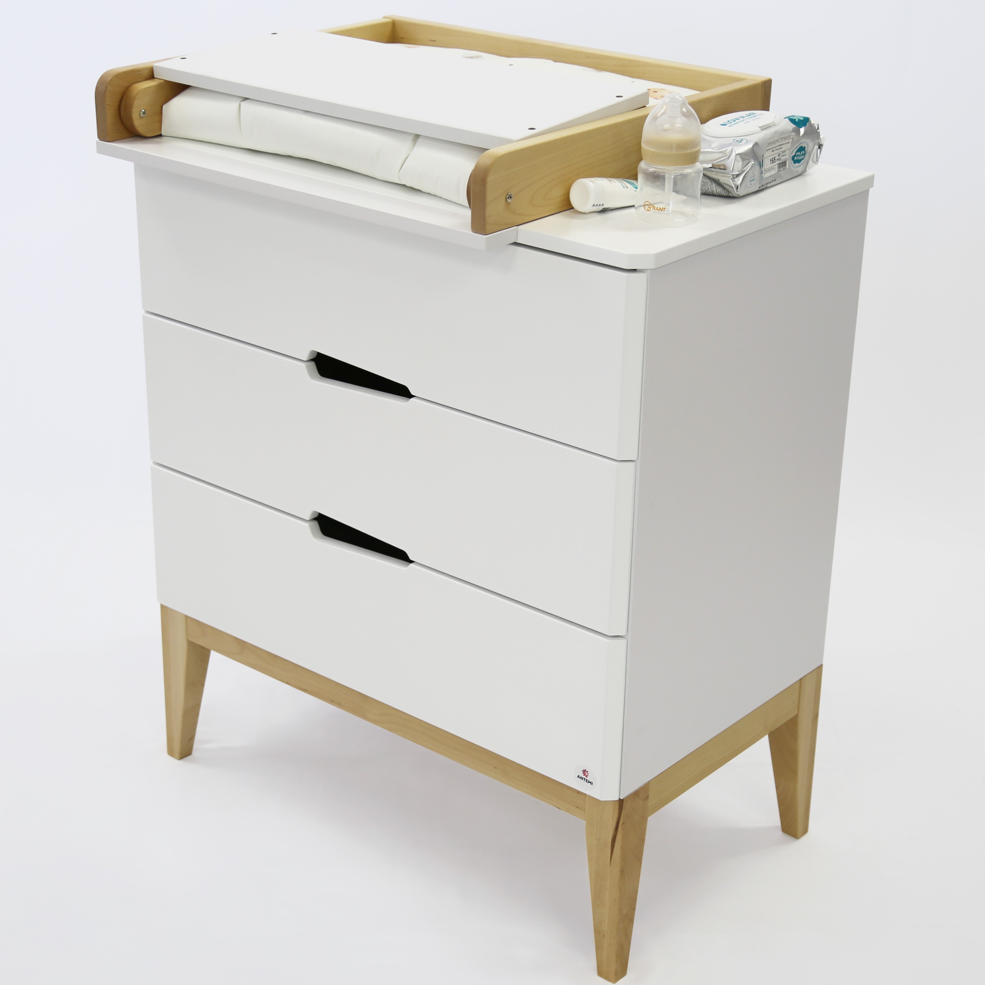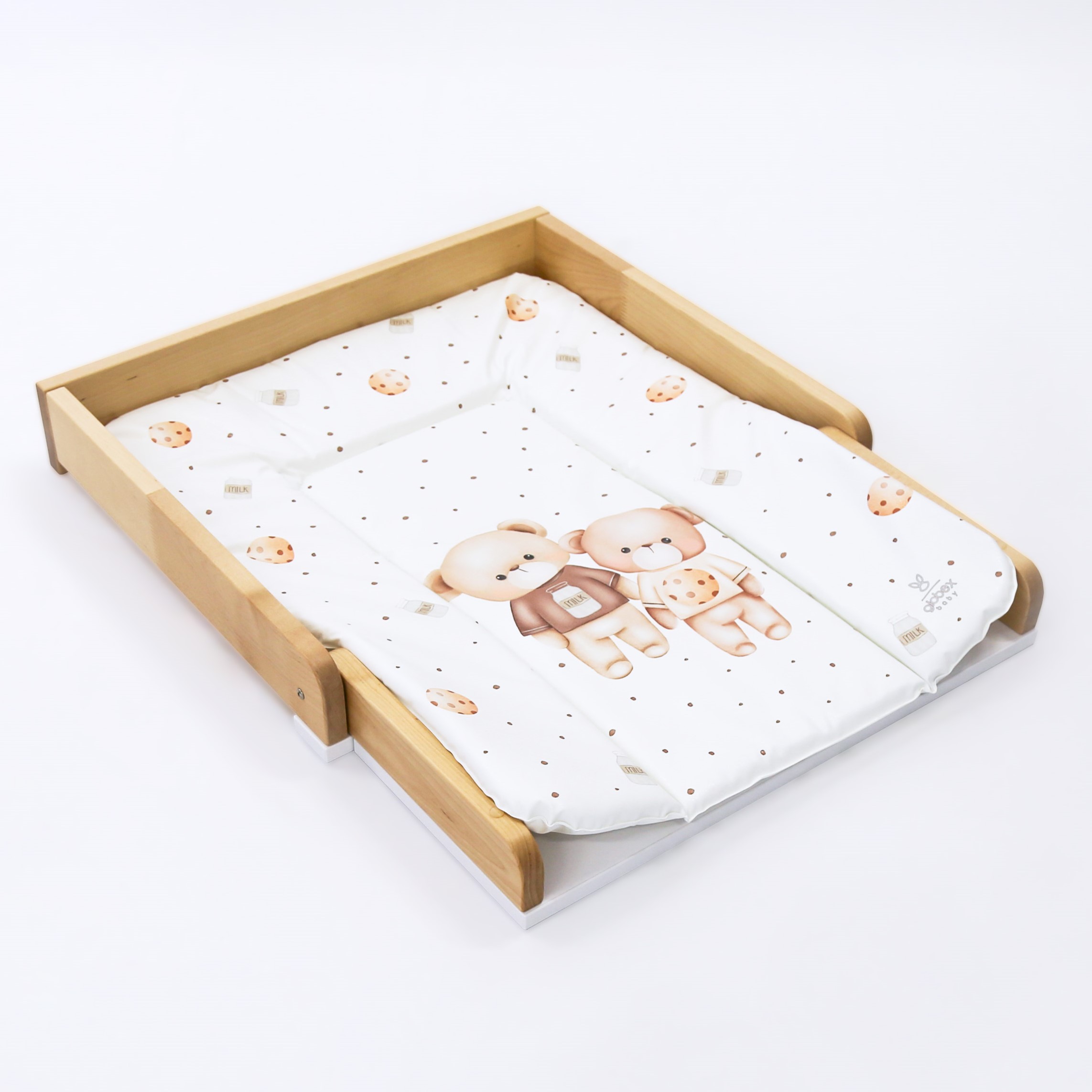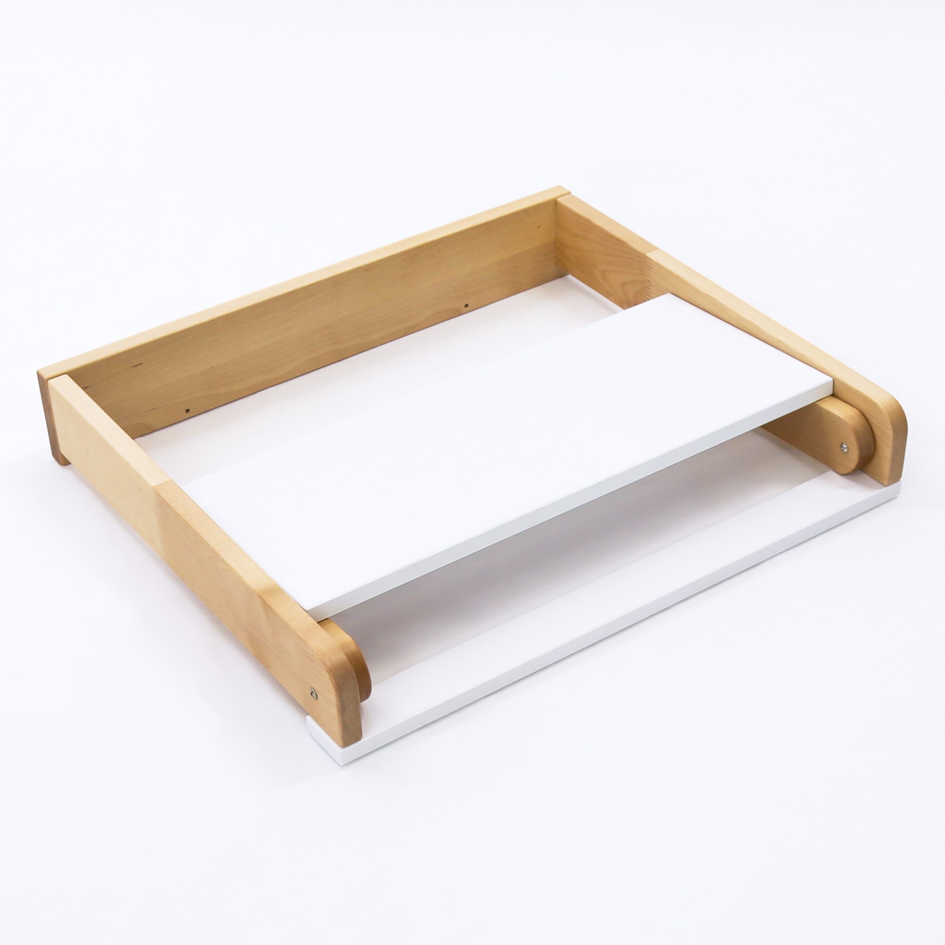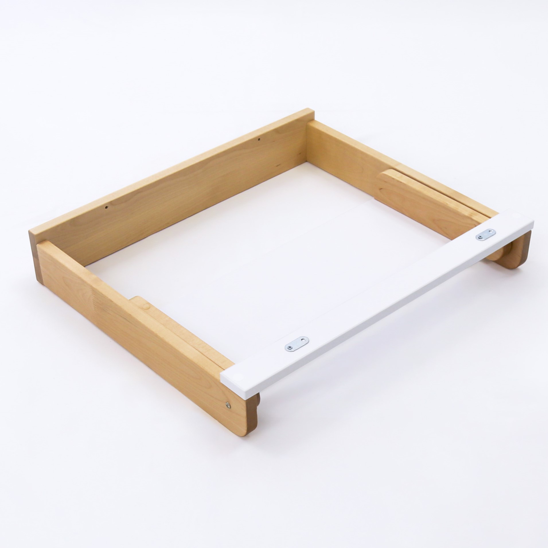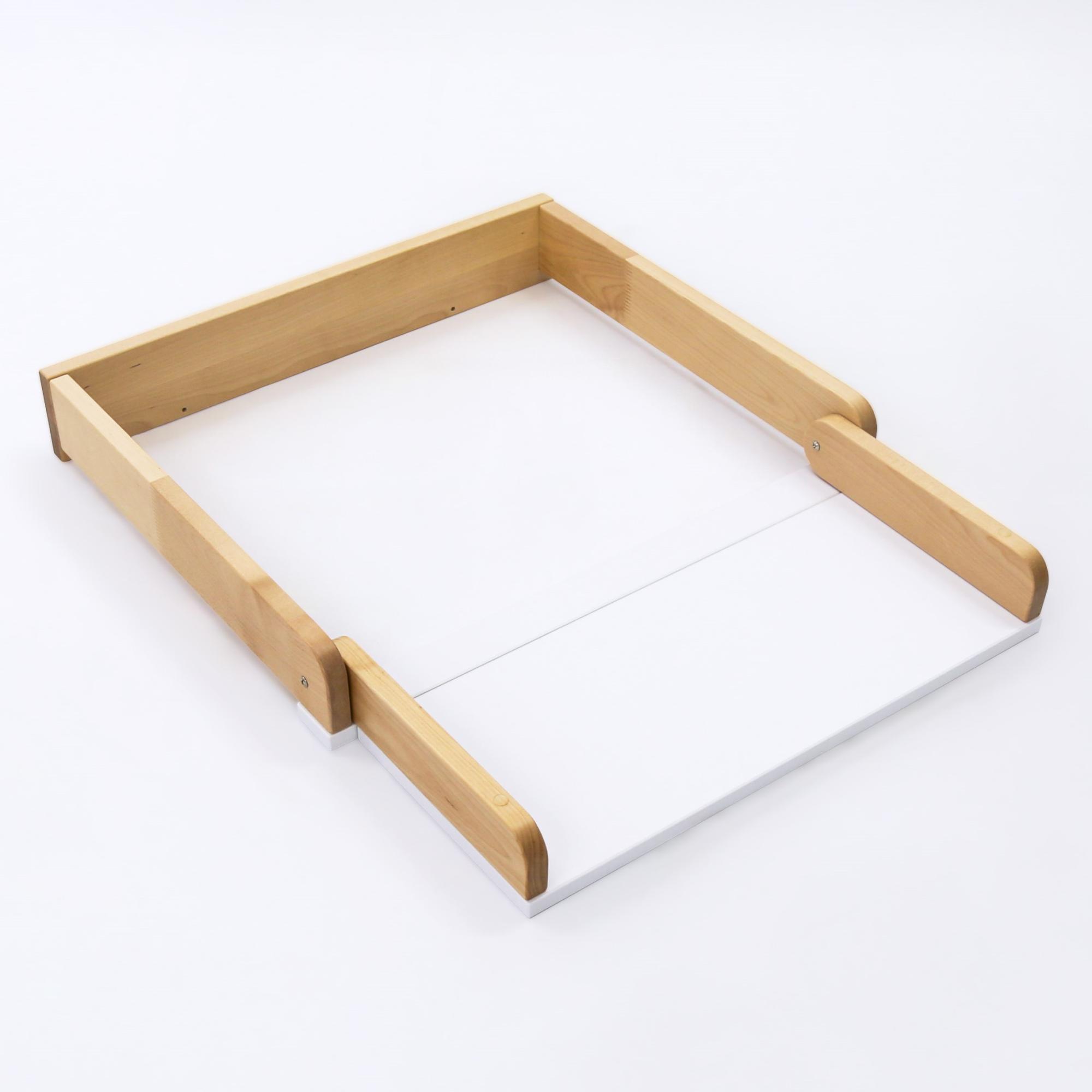 Складной универсальный пеленальный столик (СУПС) - это идеальное изделие для установки на крышку комода и пеленания малыша от 0 до 6 месяцев. Складная пеленальная доска удобна тем, что при ненадобности пеленания ребенка, ее можно сложить и пользоваться комодом, как полноценным и эксплуатировать все ящики без ограничений. Еще одна отличительная черта СУПСа - крепление к комоду, без лишних отверстий в плоскости крышки. С помощью винтов(сзади) и крепежных пластинок (спереди) данный столик стоит жестко.
