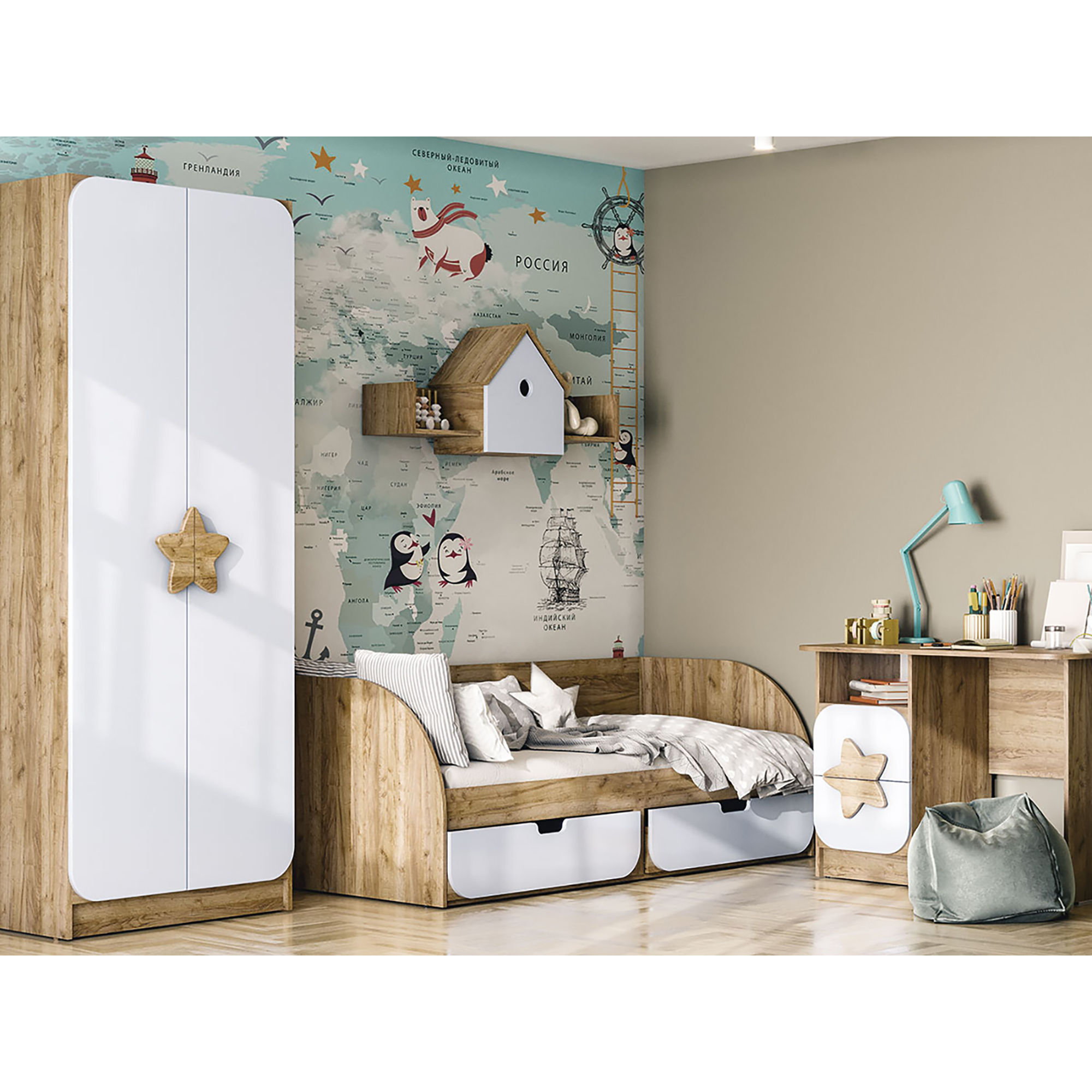 - Отличительный элемент дизайна – настенные полки, стилизованные под скворечник, и округлые формы фасадов.
