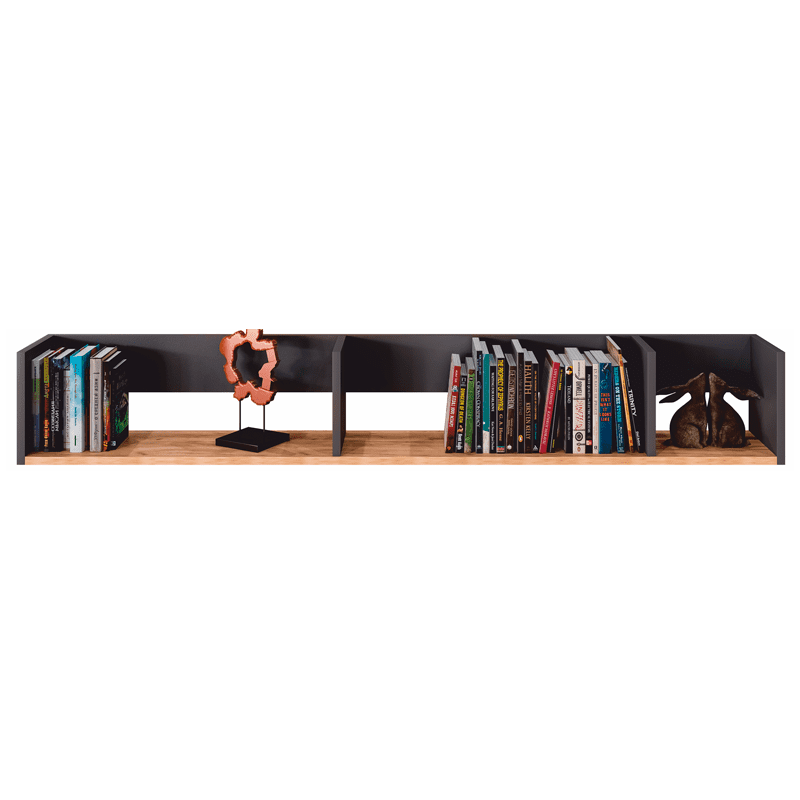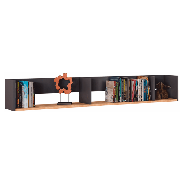 Полка сочетает в себе теплый дуб золотой и вставки из серого графита, создавая гармоничный визуальный контраст. Она идеально подходит для размещения книг, декоративных предметов и аксессуаров, позволяя организовать пространство с умом.