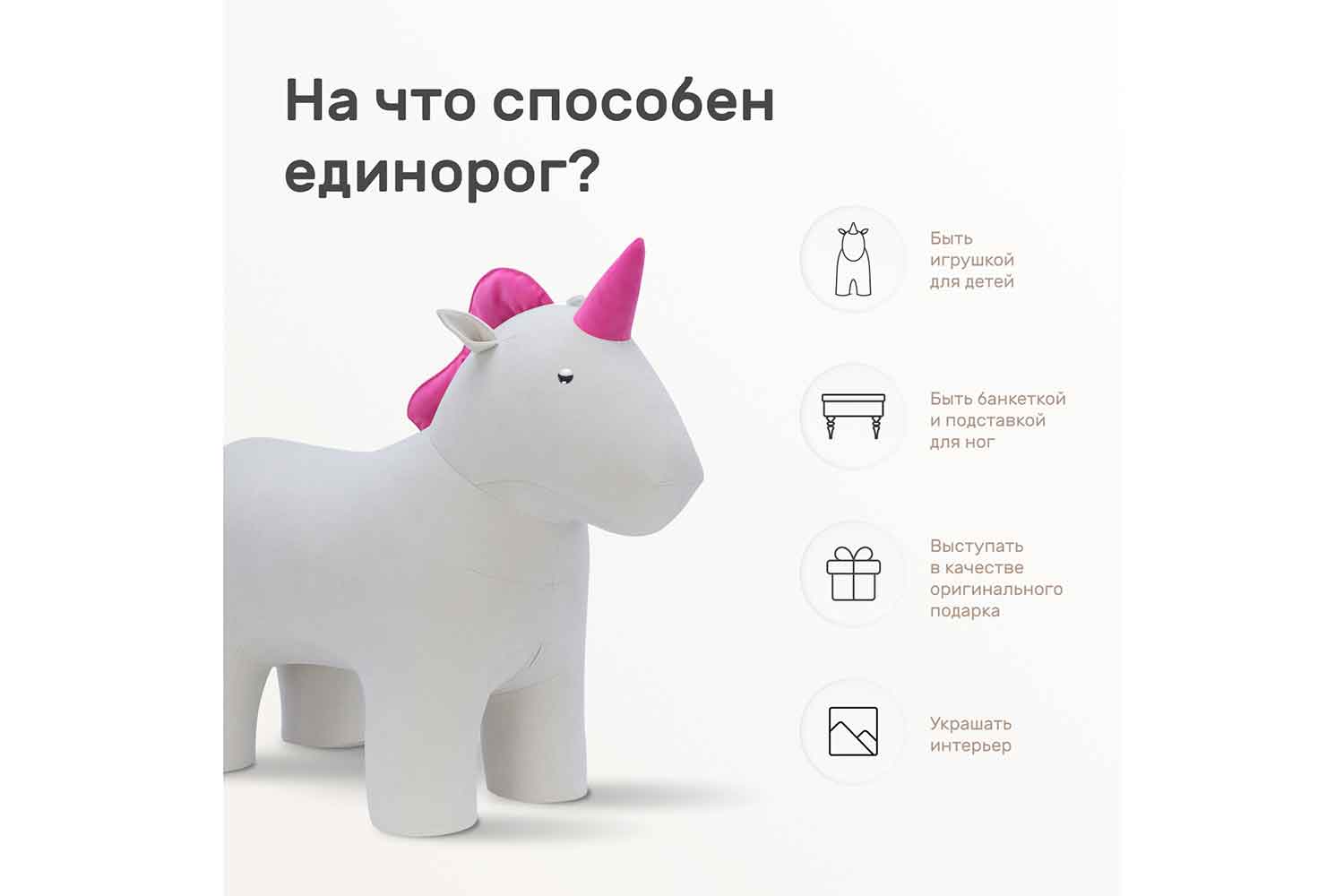 Мечтали когда-нибудь побывать в сказке и встретить единорога? К вашим услугам его компактная версия. Маленькое, мягкое сказочное животное с радостью станет другом вашего ребёнка или пуфом для ног во время просмотра любимого сериала.