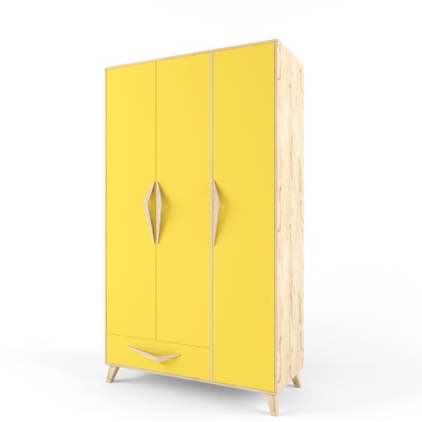 Шкаф трехстворчатый из коллекции 2+2 с ярко желтыми фасадами и ручками- "птичка" предназначен для хранения одежды и белья.