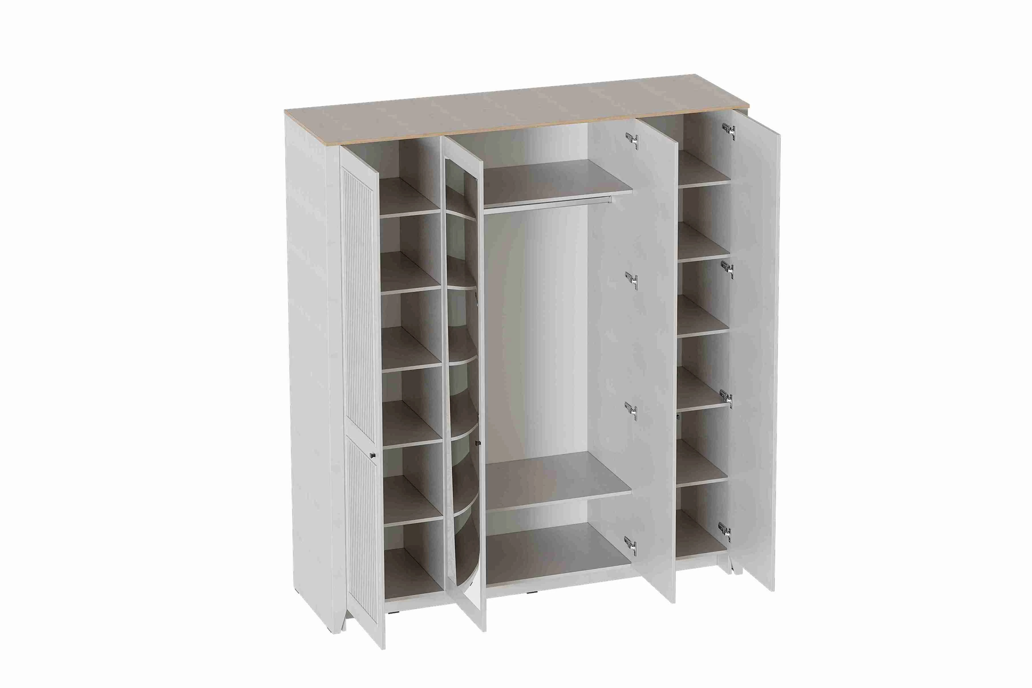 Шкаф 4 дверный Валенсия с зеркалом выполнен из (ЛДСП) в комбинации Дуб натуральный светлый / Персидский жемчуг.
