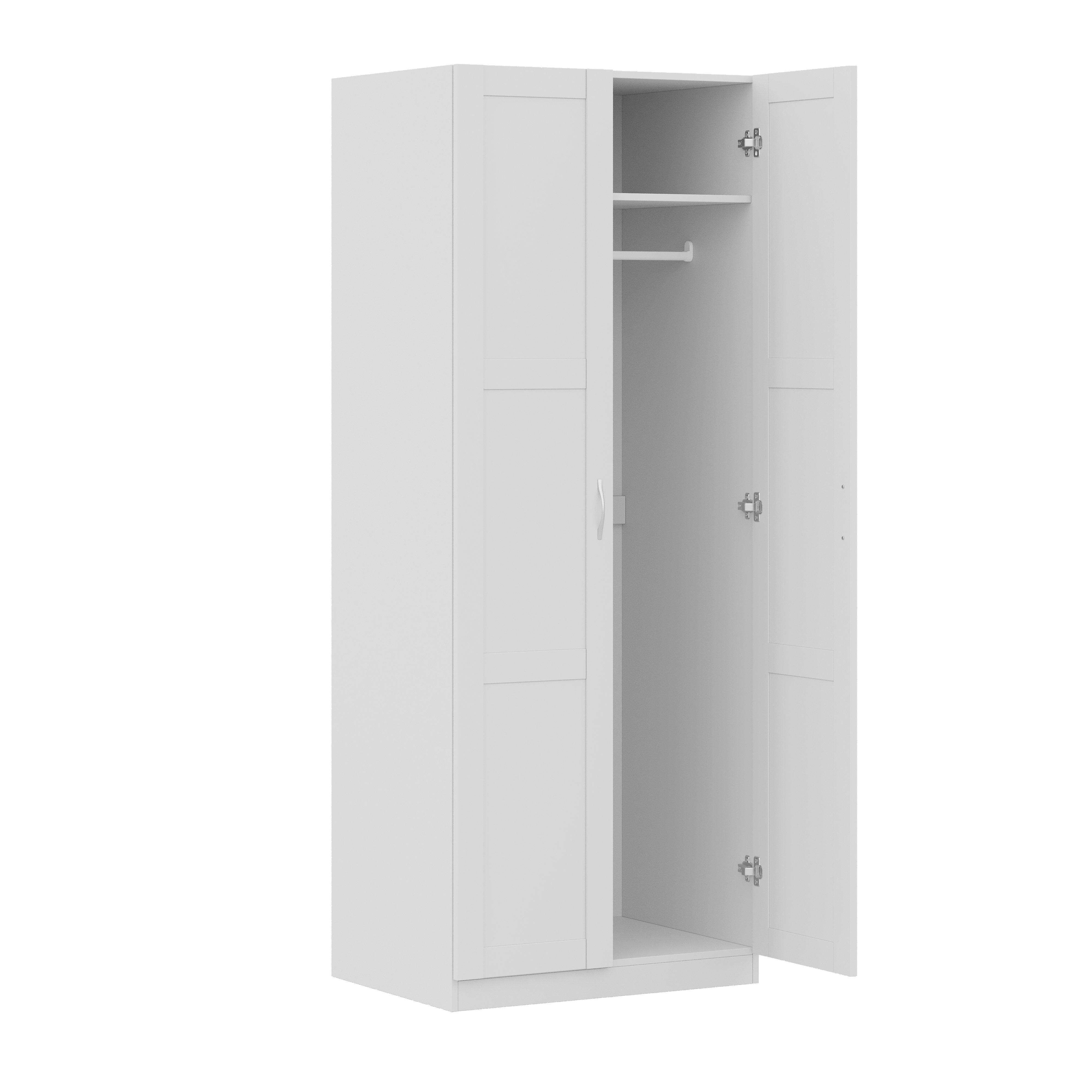 Шкаф ПЕГАС для одежды двухдверный, дверь сборная, 780х580х2020, цвет Белый. Укомплектован полкой и штангой для вешалок. Изготовлен из кашированного ДСП толщиной 16 мм. Крепится к стене. Гарантийный срок для жилых помещений 24 месяца,