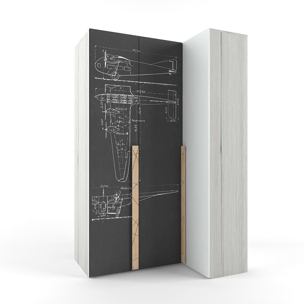 Детали из натурального дерева. Фотопечать, изюминка комплекта — УФ-печать с изображением формул или авиационных чертежей. Она разбавляет строгость фасадов и становится научным консультантом для ребенка.