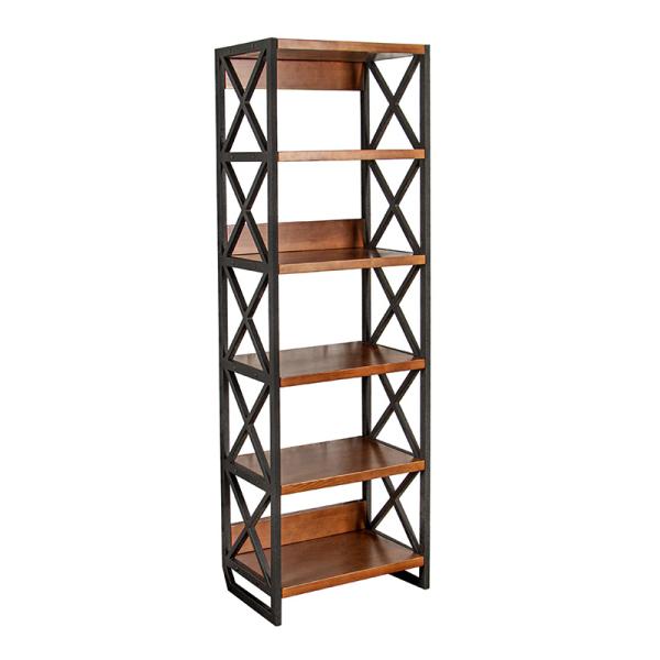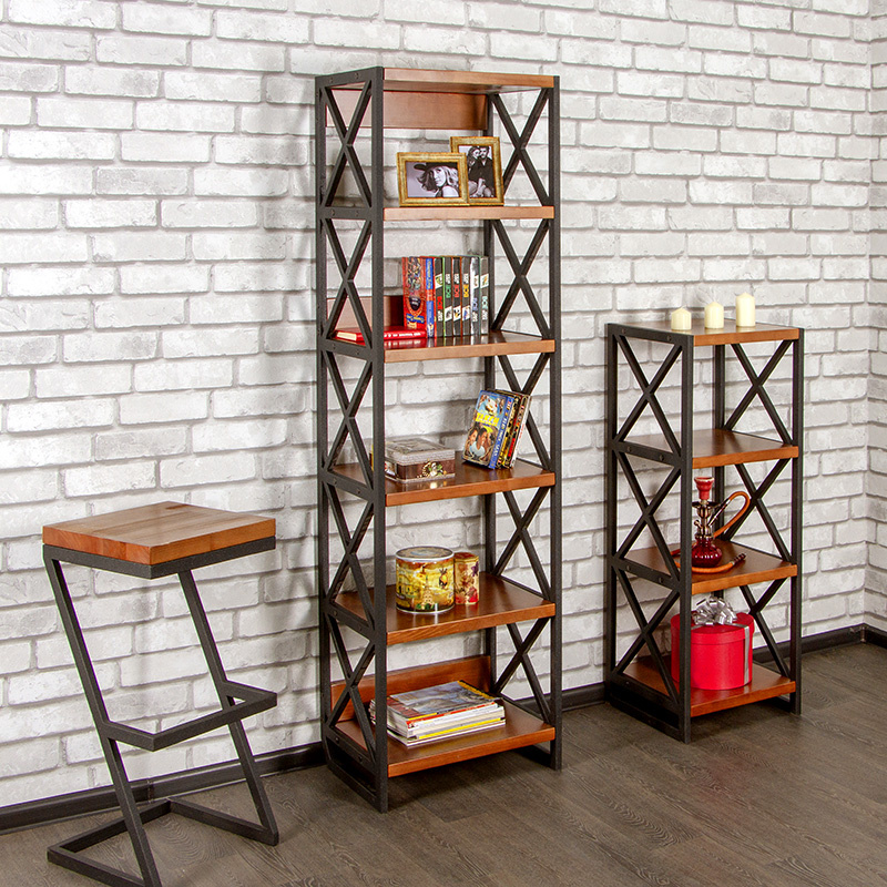 Стеллаж изготовлен из металла с порошковой покраской и массива сосны в двух цветах: «Ирокко морение» и «Орех средний»