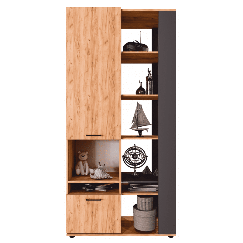 Основной акцент сделан на сочетании материалов: теплый дуб золотой гармонично контрастирует с вставками из серого графита, создавая эффектный визуальный баланс. Стеллаж оснащен двумя дверцами, которые позволяют скрыть самые ценные вещи от посторонних глаз, обеспечивая безопасность и порядок.
