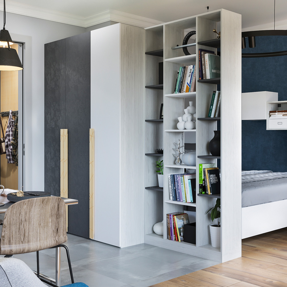 Зонирование и визуальное расширение свободного пространства комнаты – непростая задача, решить которую можно с помощью стеллажа-перегородки из молодежной коллекции НьюТон . Несмотря на кажущуюся легкость, стеллаж перегородка вполне надежен, и способен создавать функциональные раздельные зоны. Предназначен для хранения книг и игрушек.