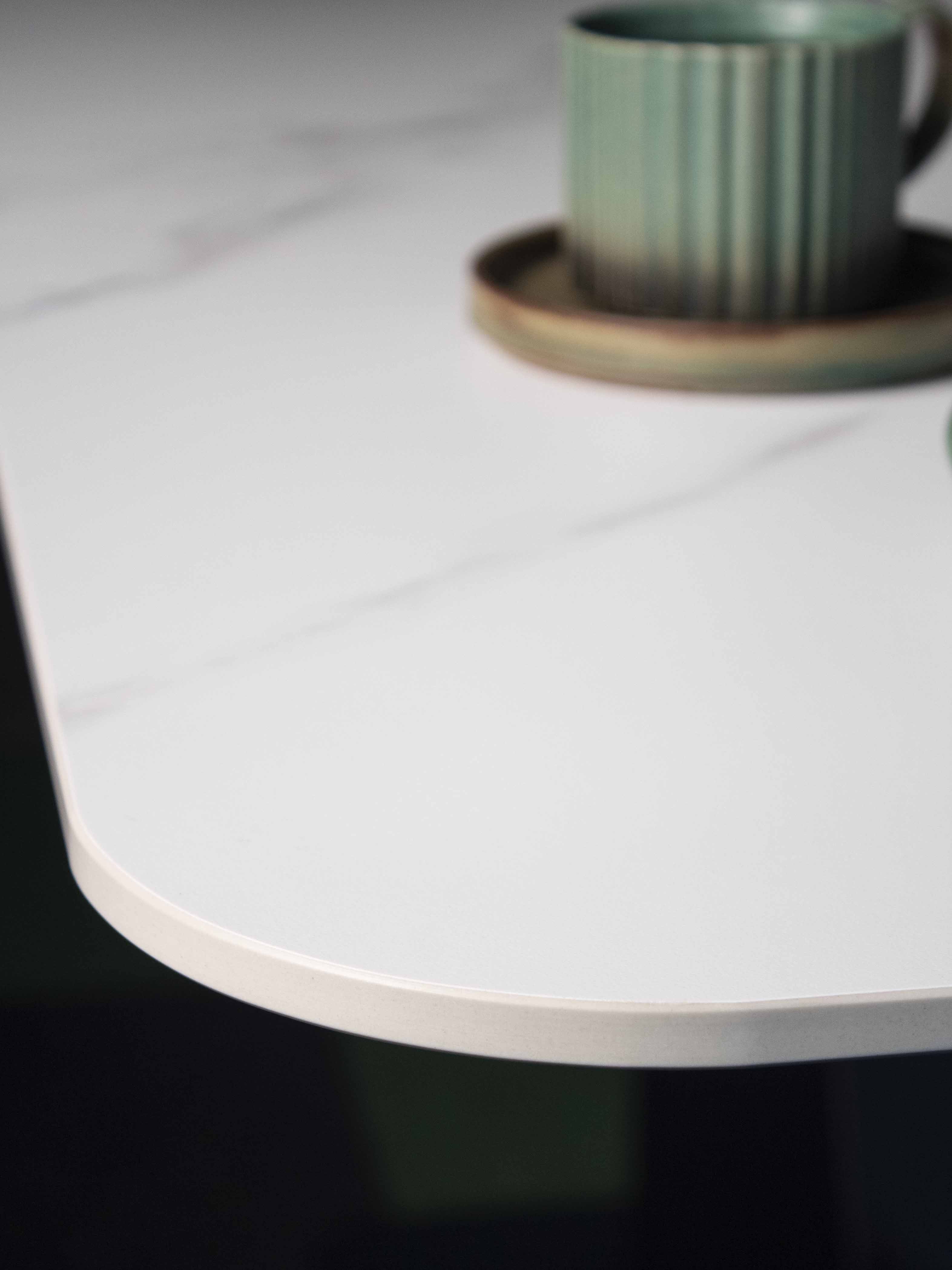 Основное преимущество такого стола – практичная столешница из натурального камня, отличающаяся износостойкостью, долговечностью, водонепроницаемостью, устойчивостью к внешним воздействиям. Не боится высоких температур, можно ставить горячие блюда. Такая столешница не впитывает влагу и легко очищается от загрязнений. Толщина столешницы 11мм, такой тонкий край делает стол визуально невесомым.
