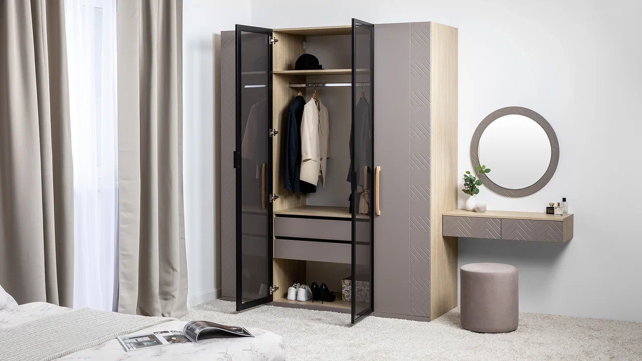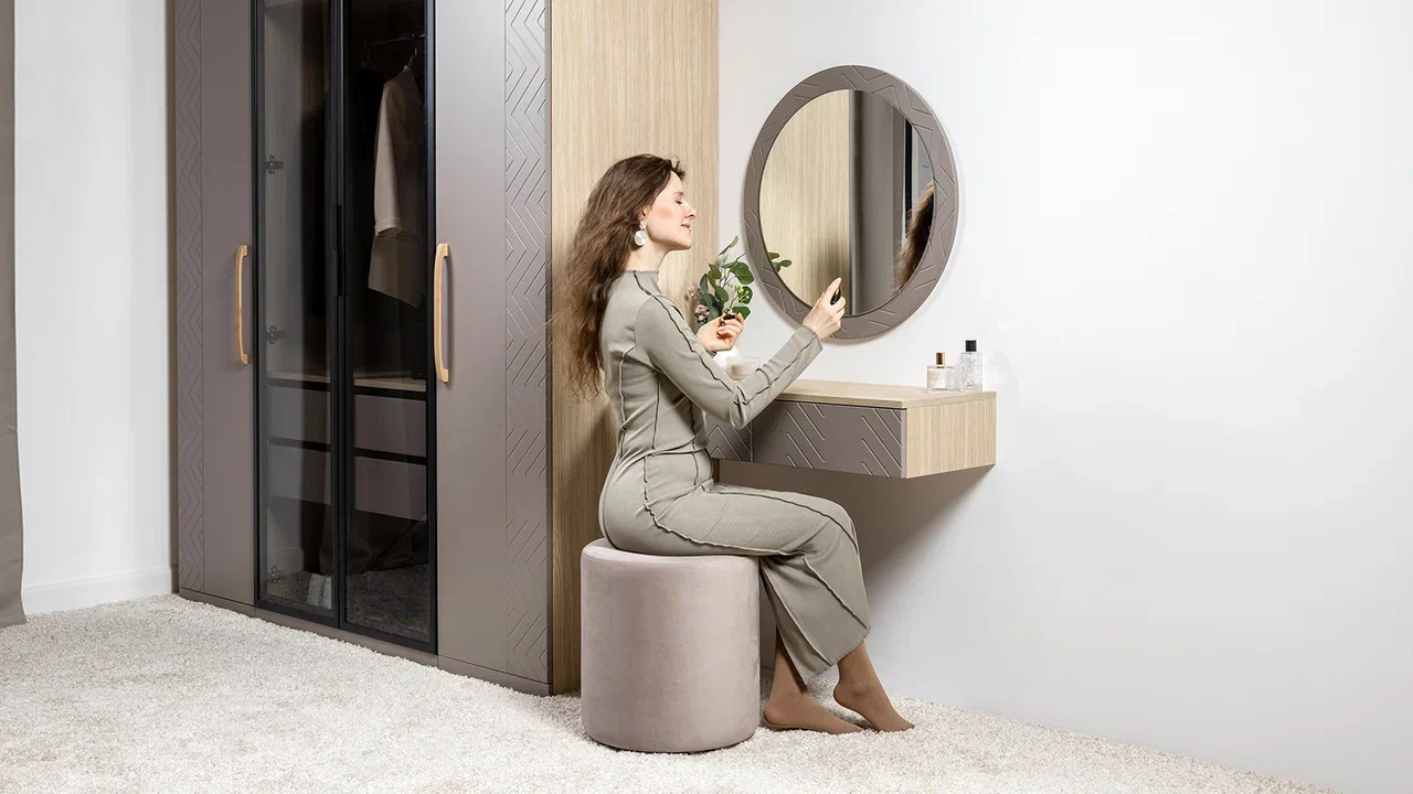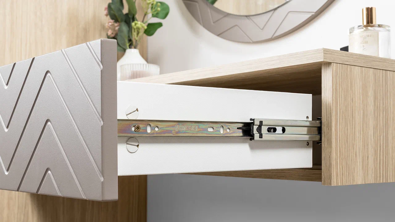Туалетный стол Амьен с двумя ящиками на шариковых механизмах полного выдвижения (крепится к стене на трёх усиленных подвесах). Его можно дополнить зеркалом и пуфом из этой же серии. С таким столиком вам будет удобно ухаживать за своей внешностью в комфортной обстановке