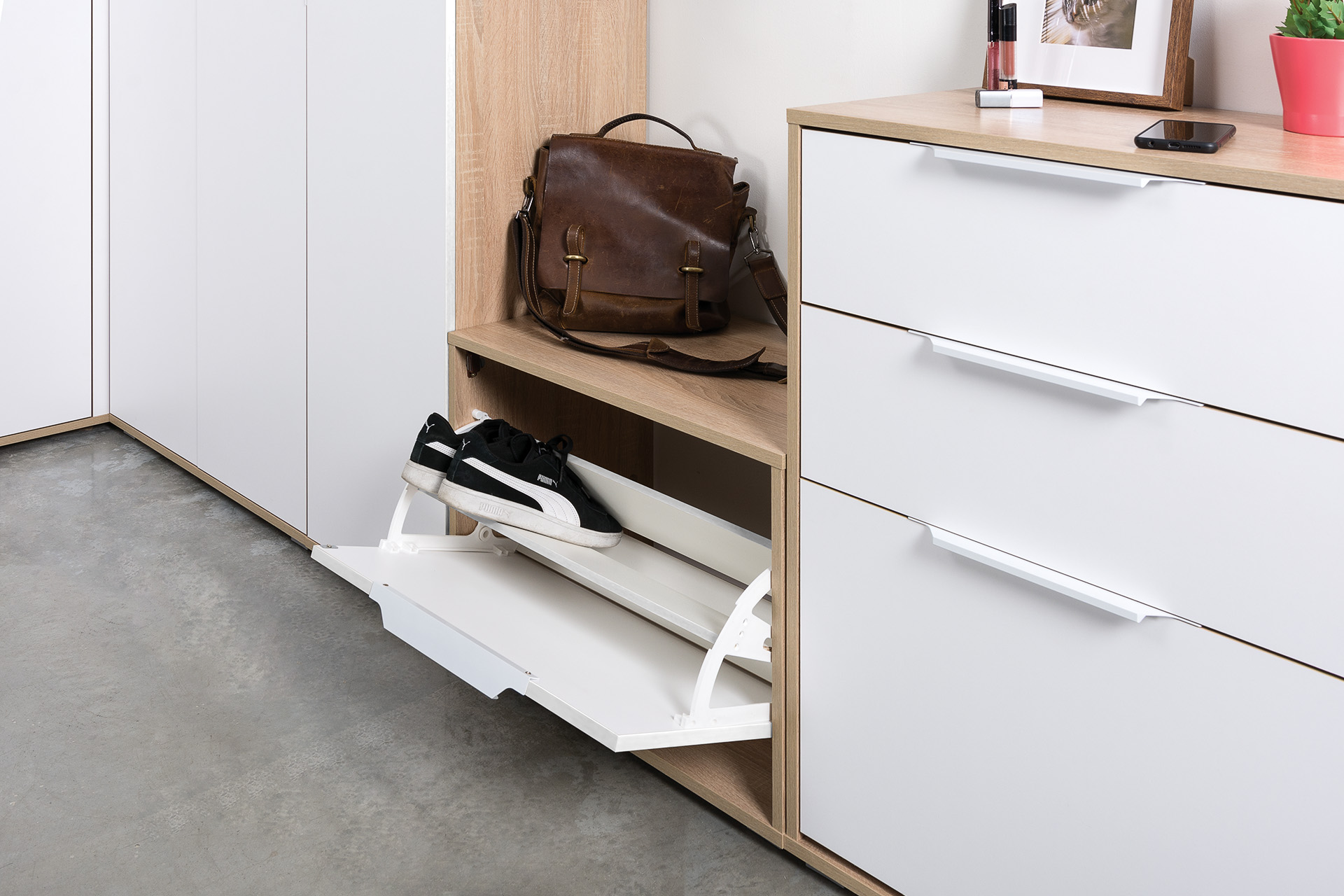Тумба Обувница Куба — компактный вариант для небольшой прихожей. Светлые тона модели позволят сделать интерьер визуально более легким и просторным.