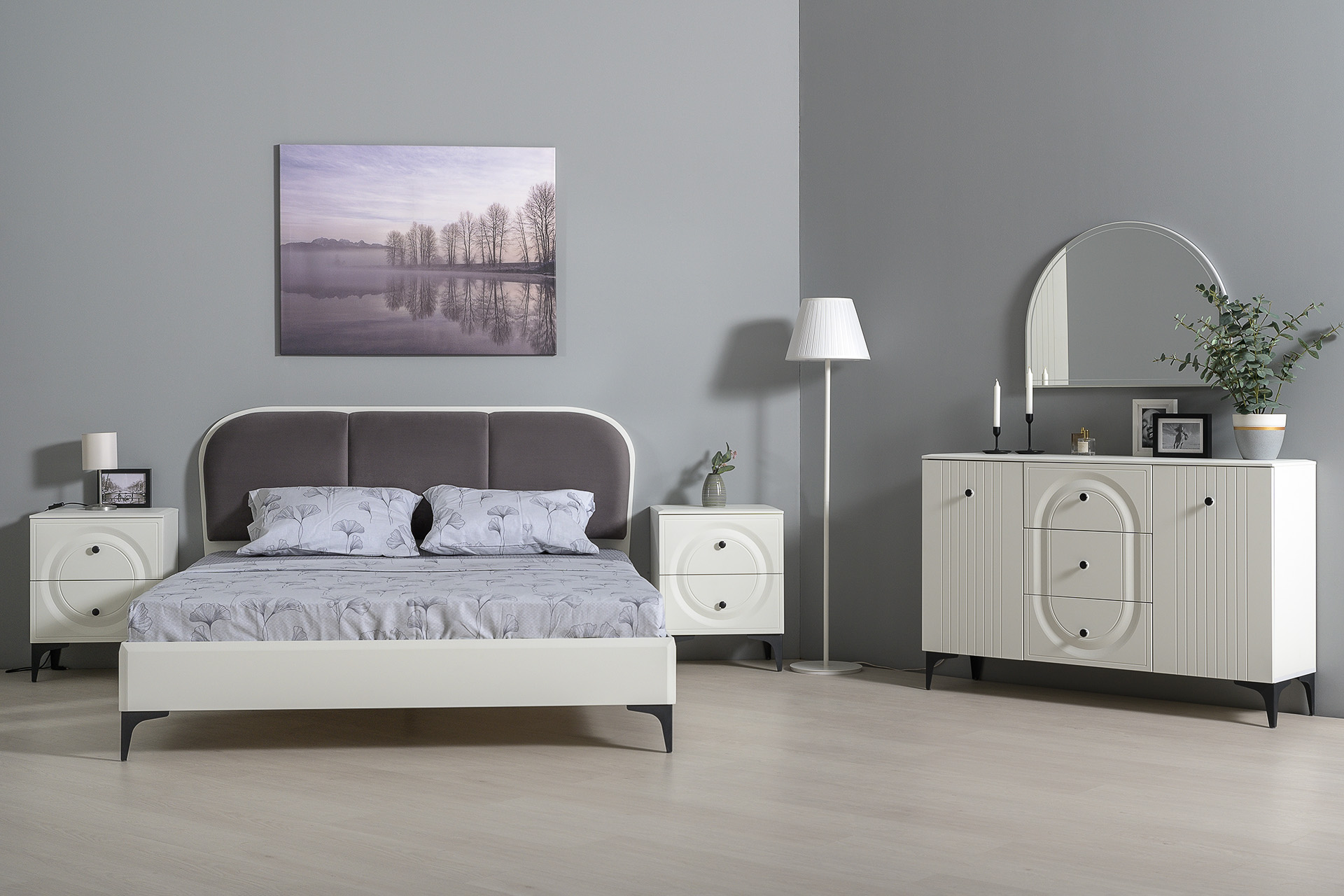 Фасады выполнены из МДФ с матовой ПВХ-плёнкой. Такое решение делает мебель визуально более "мягкой", комфортной и расслабляющей, что особенно актуально для спальни.