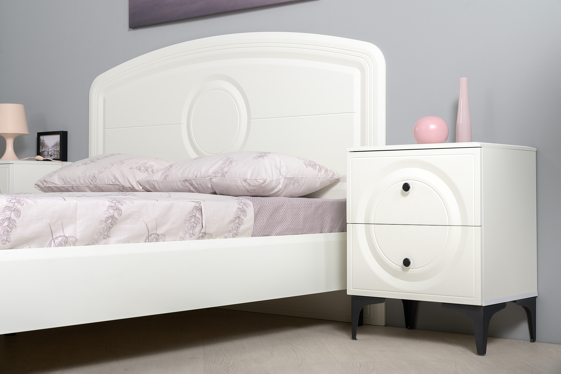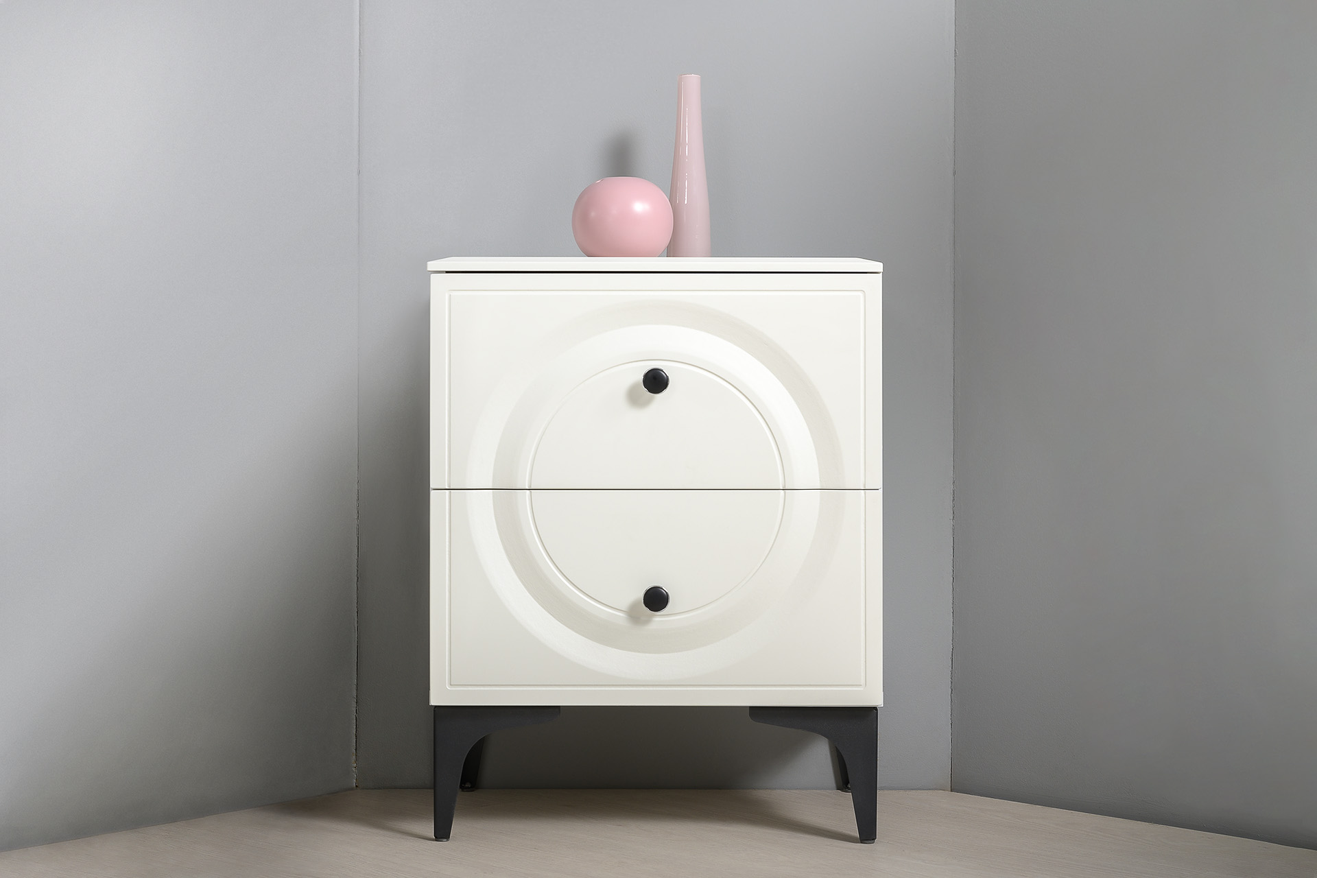 Основным декоративным элементом является круг, представленный фрезеровкой на фасаде тумбы.