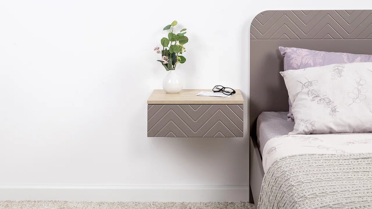 Навесная прикроватная тумба Амьен (крепится к стене на двух усиленных подвесах) оснащена ящиком на шариковых механизмах полного выдвижения. Является удобным дополнением к кровати для быстрого доступа к нужным предметам: светильник, смартфон, книга, пульт, напитки…