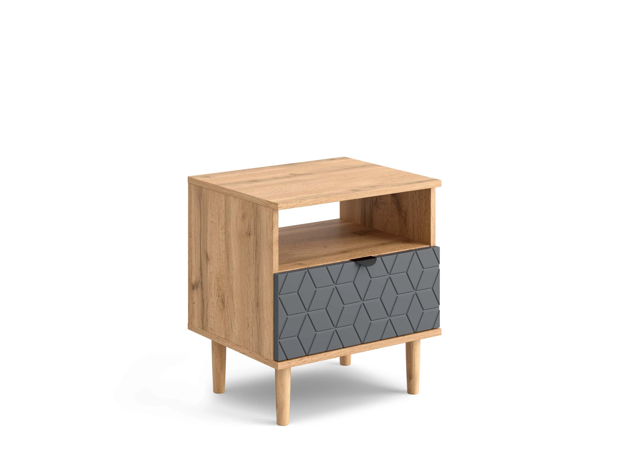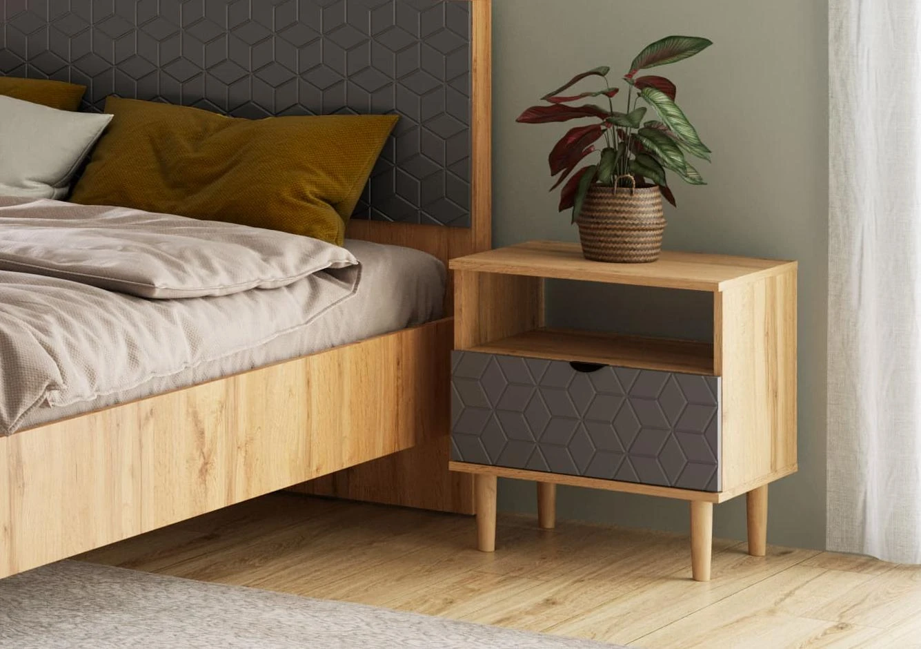 Прикроватная тумба с выдвижным ящиком имеет достаточно места для хранения различных предметов, таких как книги, журналы, зарядные устройства.