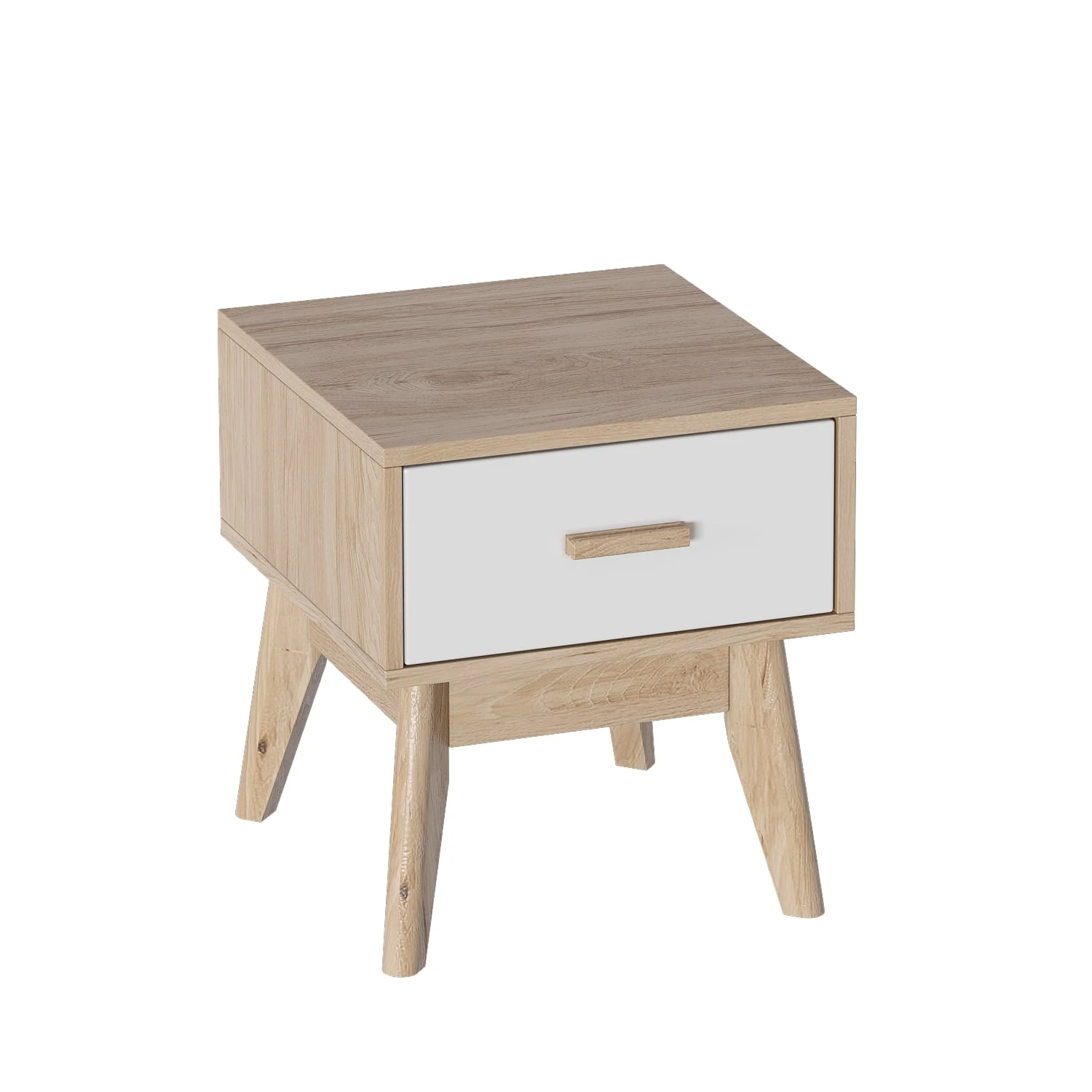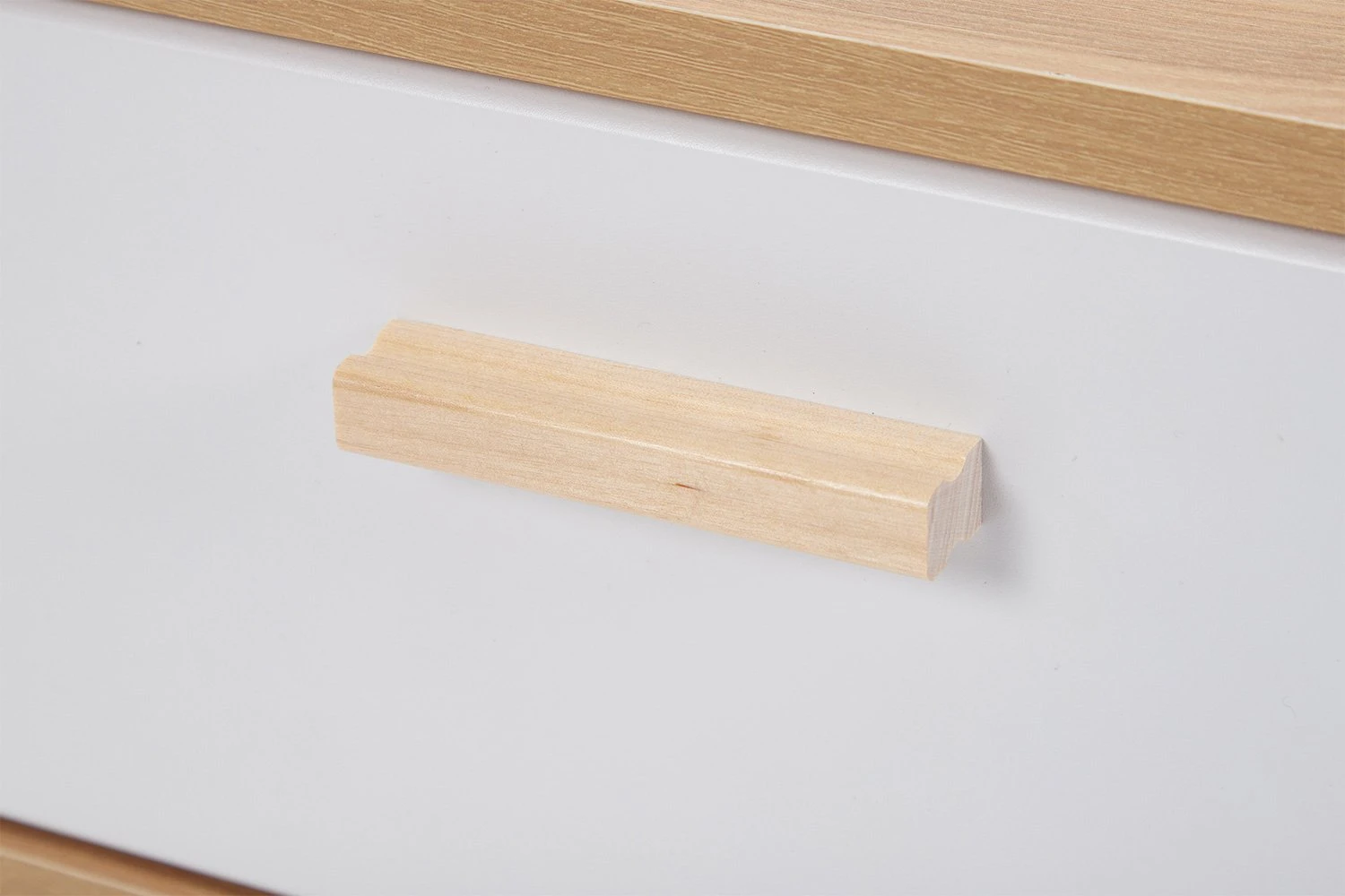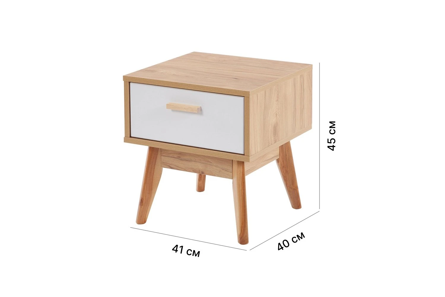 Тумба на четырех высоких стильных ножках из массива березы словно парит над полом, не загромождая пространство комнаты. Ощущения легкости и нарядности добавляет фасад из белоснежного МДФ в сочетании с корпусом из ЛДСП цвета натурального дуба. Ручка ящика выполнена из массива березы.