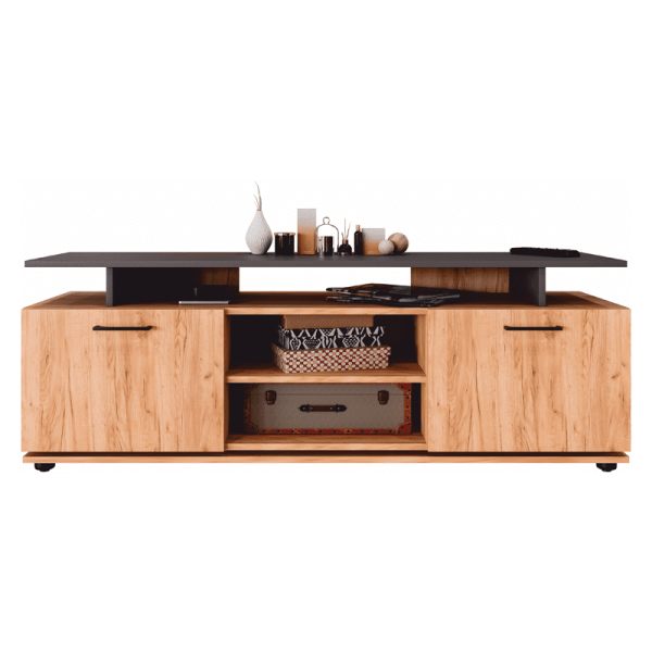Тумба оснащена двумя вместительными отделениями, которые обеспечивают достаточное пространство для хранения различных медиа-устройств и аксессуаров.
