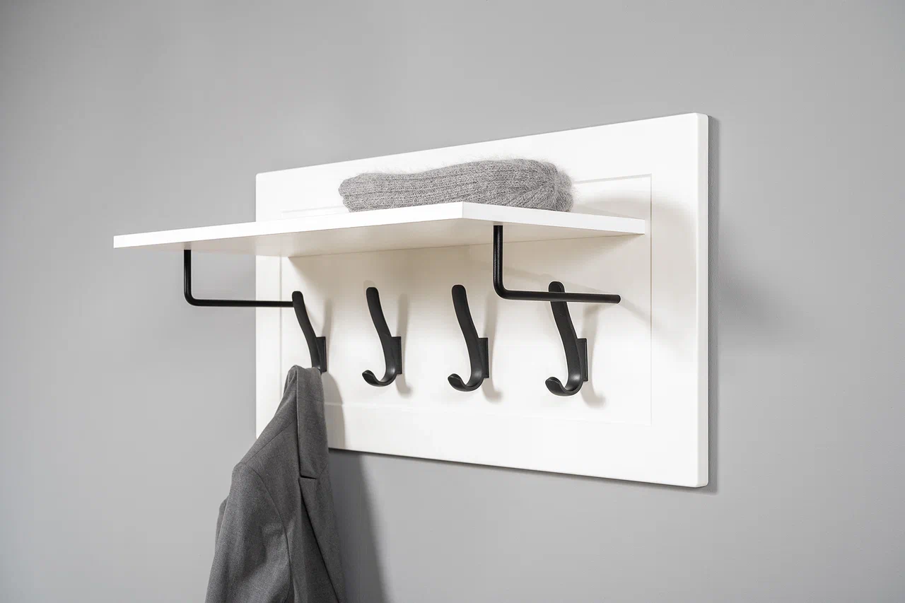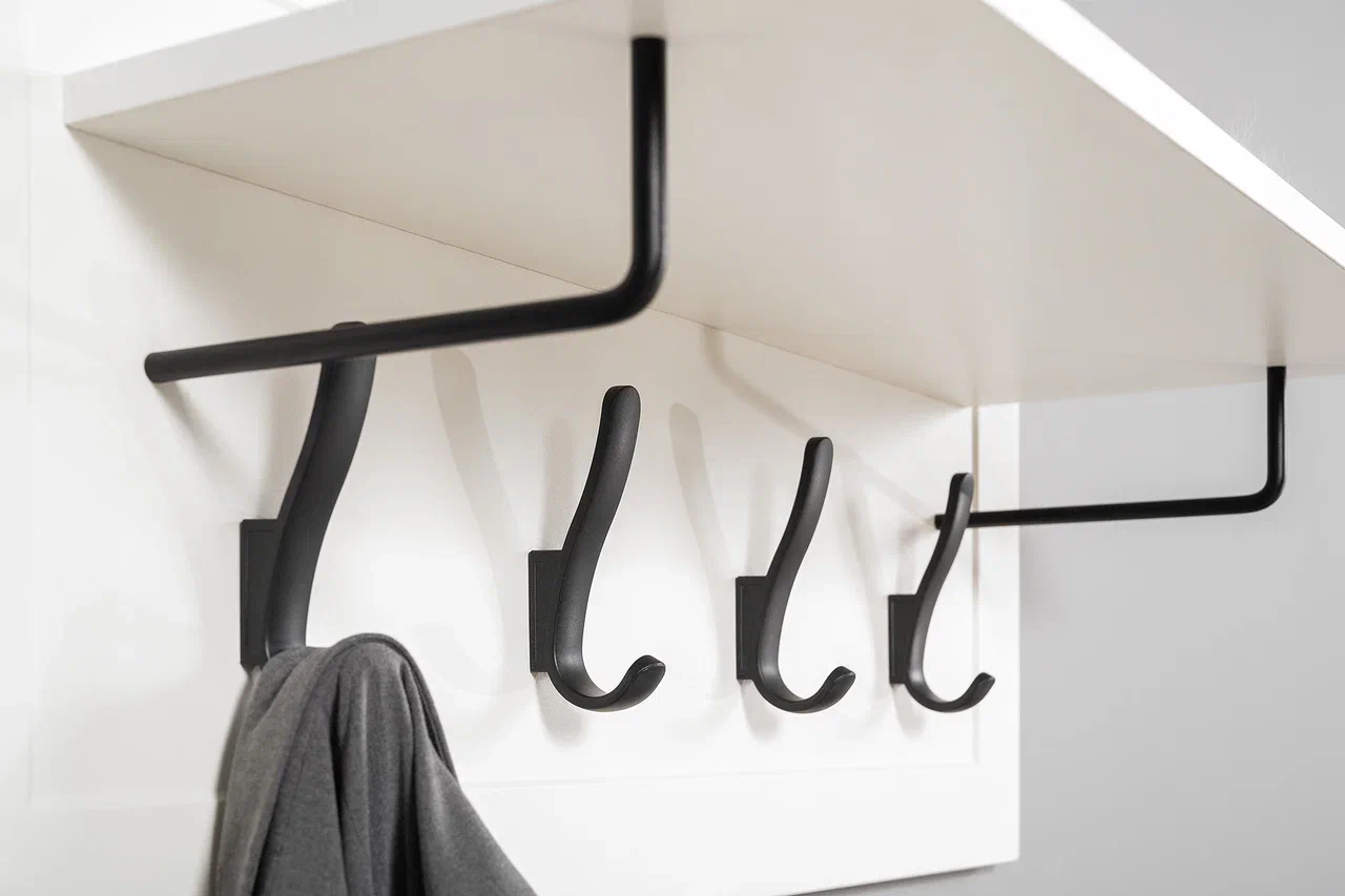 Прихожая доступна в двух цветовых решениях – белый/графит в сочетании с теплым древесным декором.